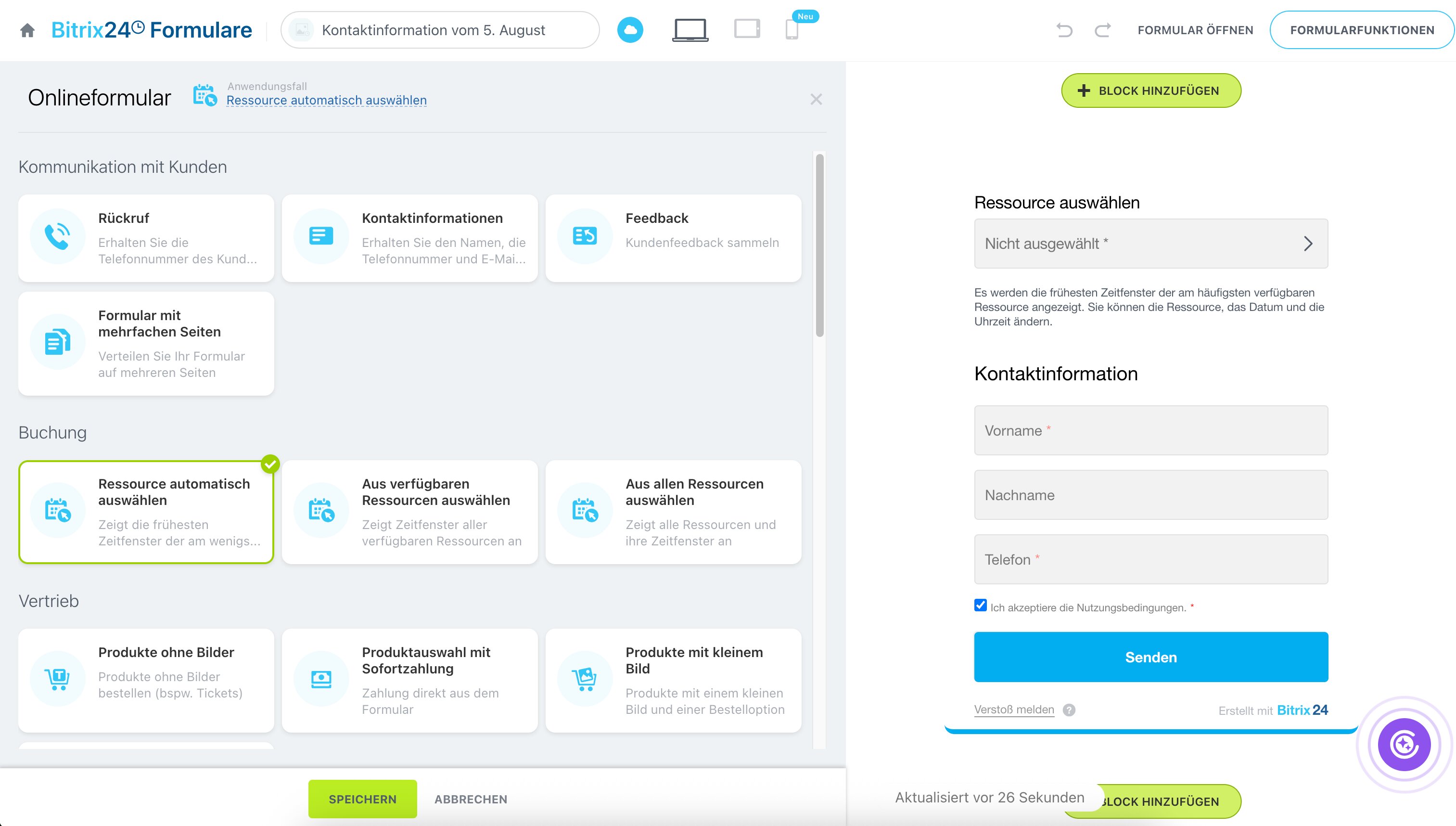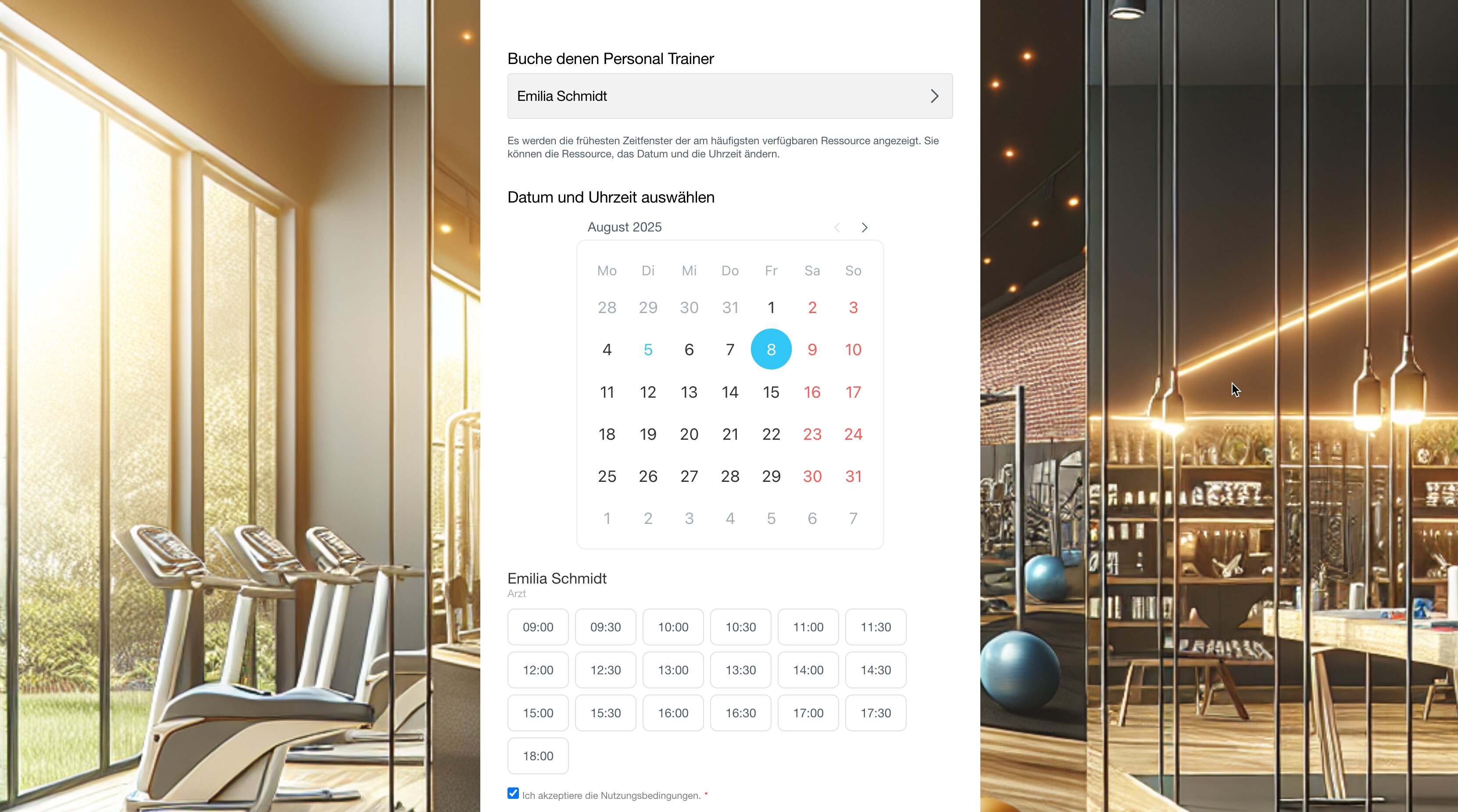 Das Formular schlägt automatisch den nächsten verfügbaren Termin und die passende Ressource vor.