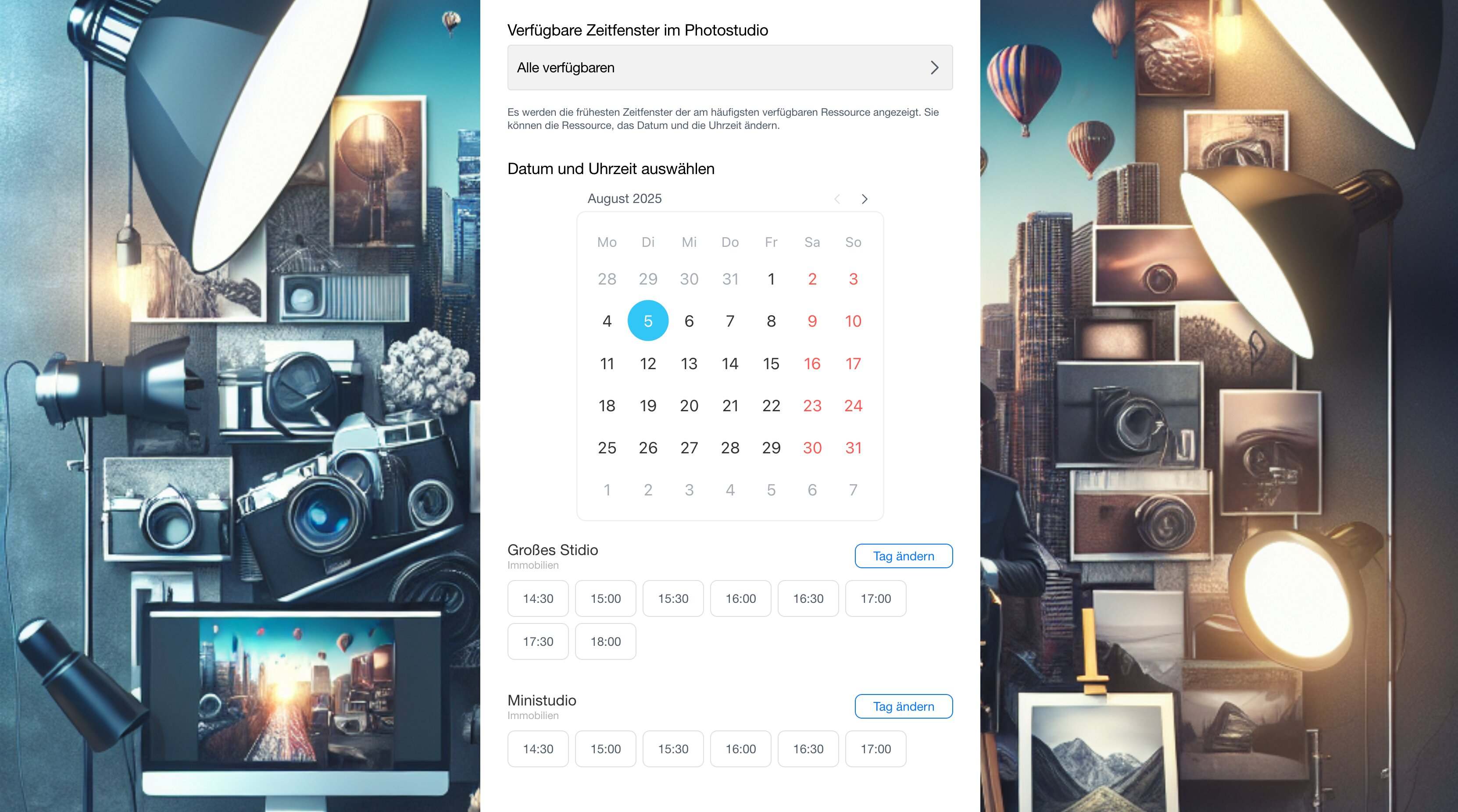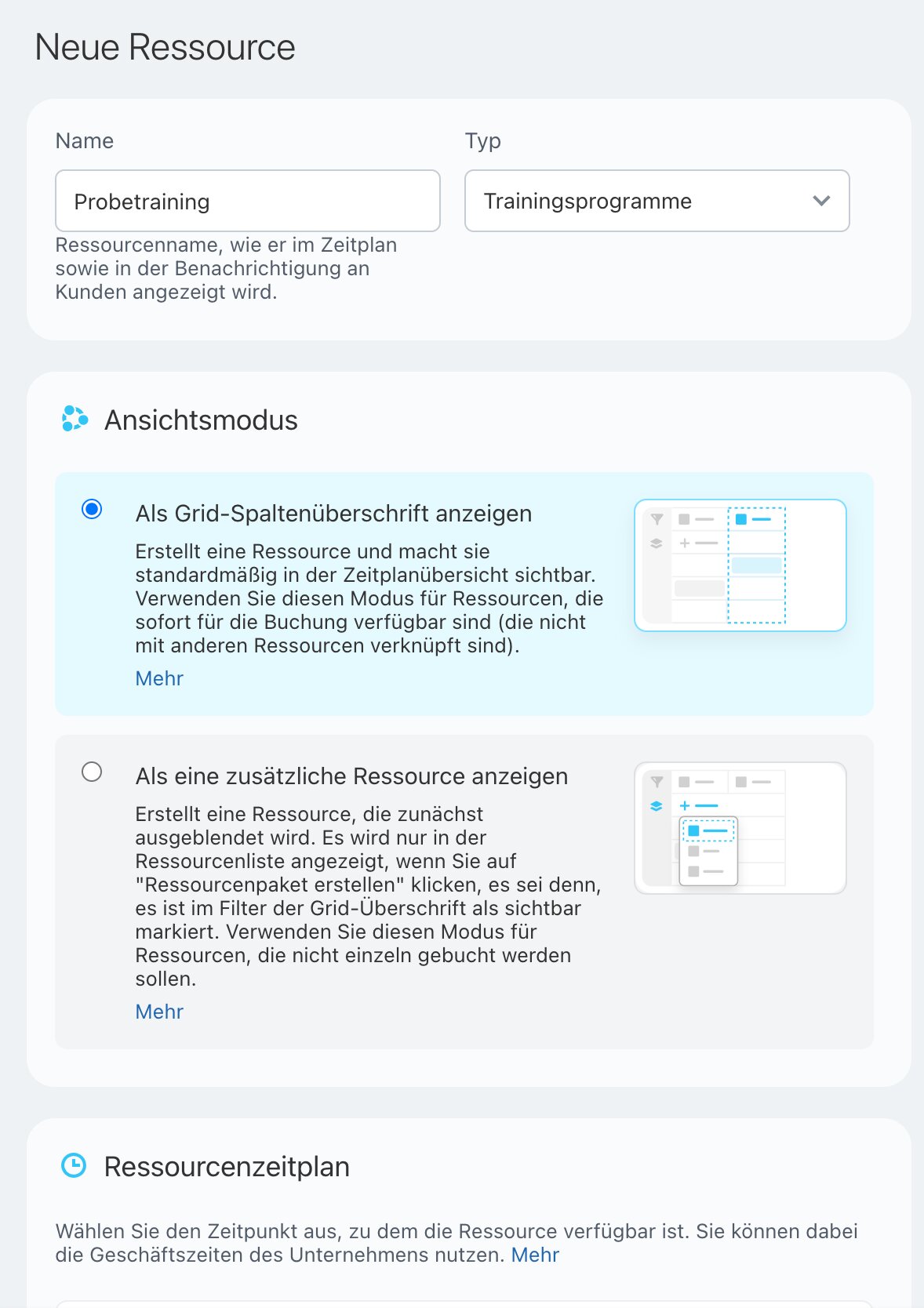 Ihre Kunden können selbstständig die Ressource, das Datum und die Uhrzeit auswählen. Diese Variante passt, wenn es nicht nur um einen freien Slot geht, sondern auch um die Buchung eines bestimmten Mitarbeiters oder Geräts.