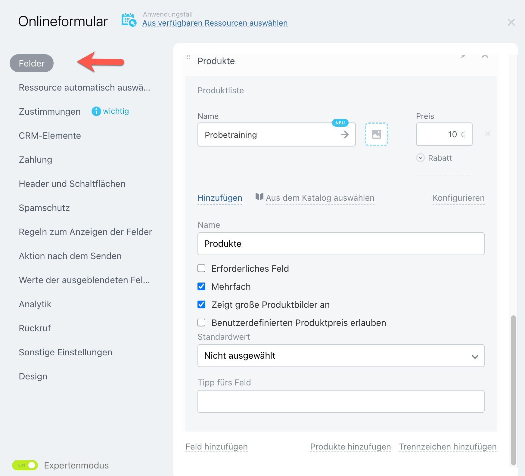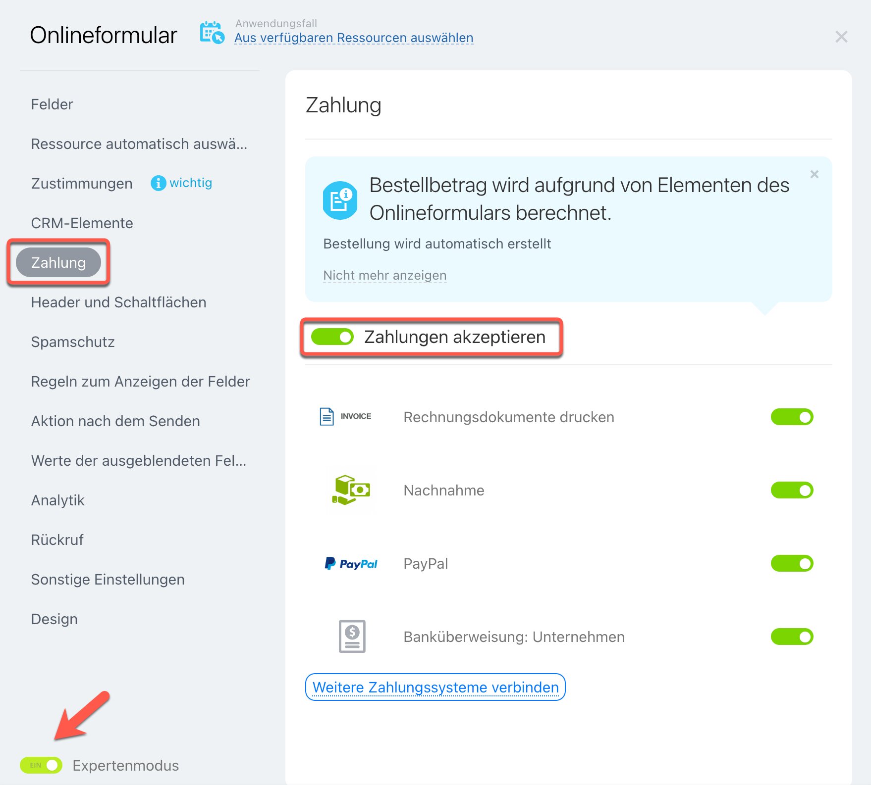 Um die Funktion zu aktivieren, schalten Sie den „Expertenmodus“ in den Formulareinstellungen ein.