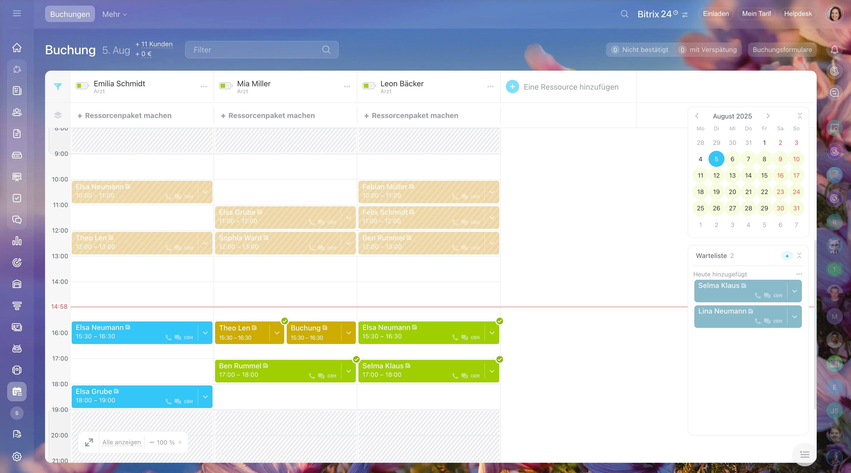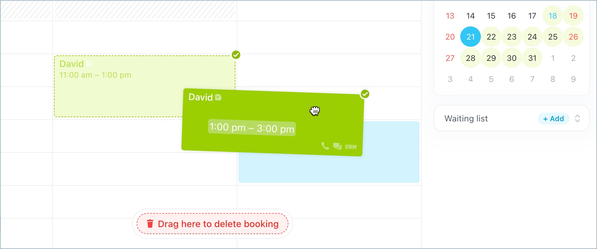 Ziehen Sie Buchungen in ein anderes Zeitfenster, verschieben Sie den Eintrag auf die Warteliste oder löschen Sie ihn.