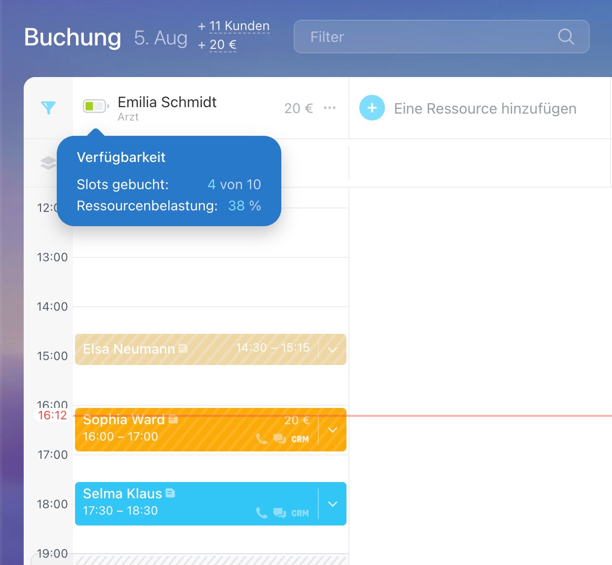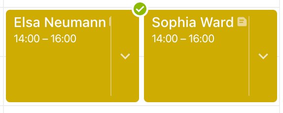 Wenn mehrere Kunden denselben Slot buchen, wird diese Zeit dunkelgelb dargestellt. Überbuchungen helfen Ihnen, Ressourcen effizient zu nutzen, falls ein Kunde absagt oder nicht erscheint.