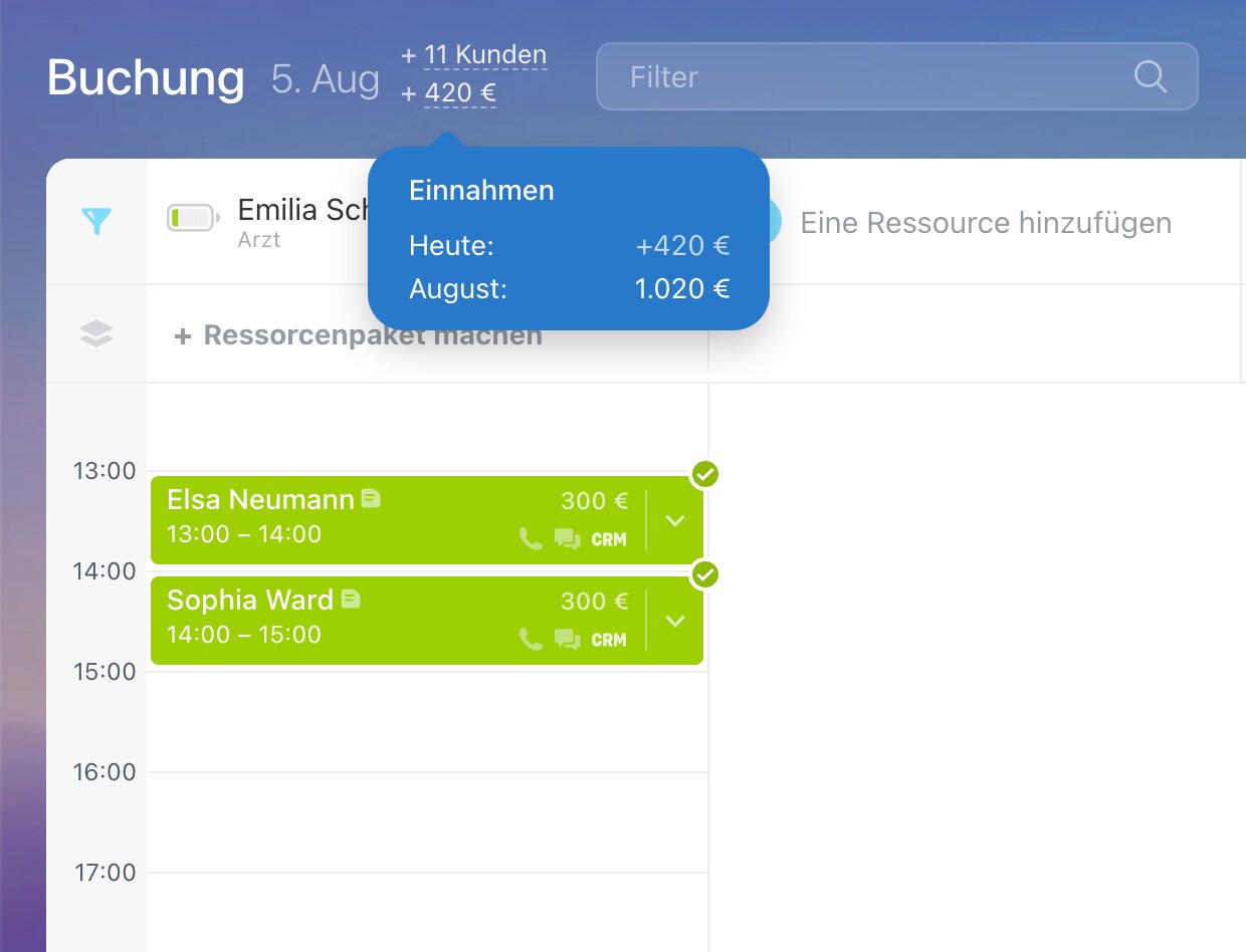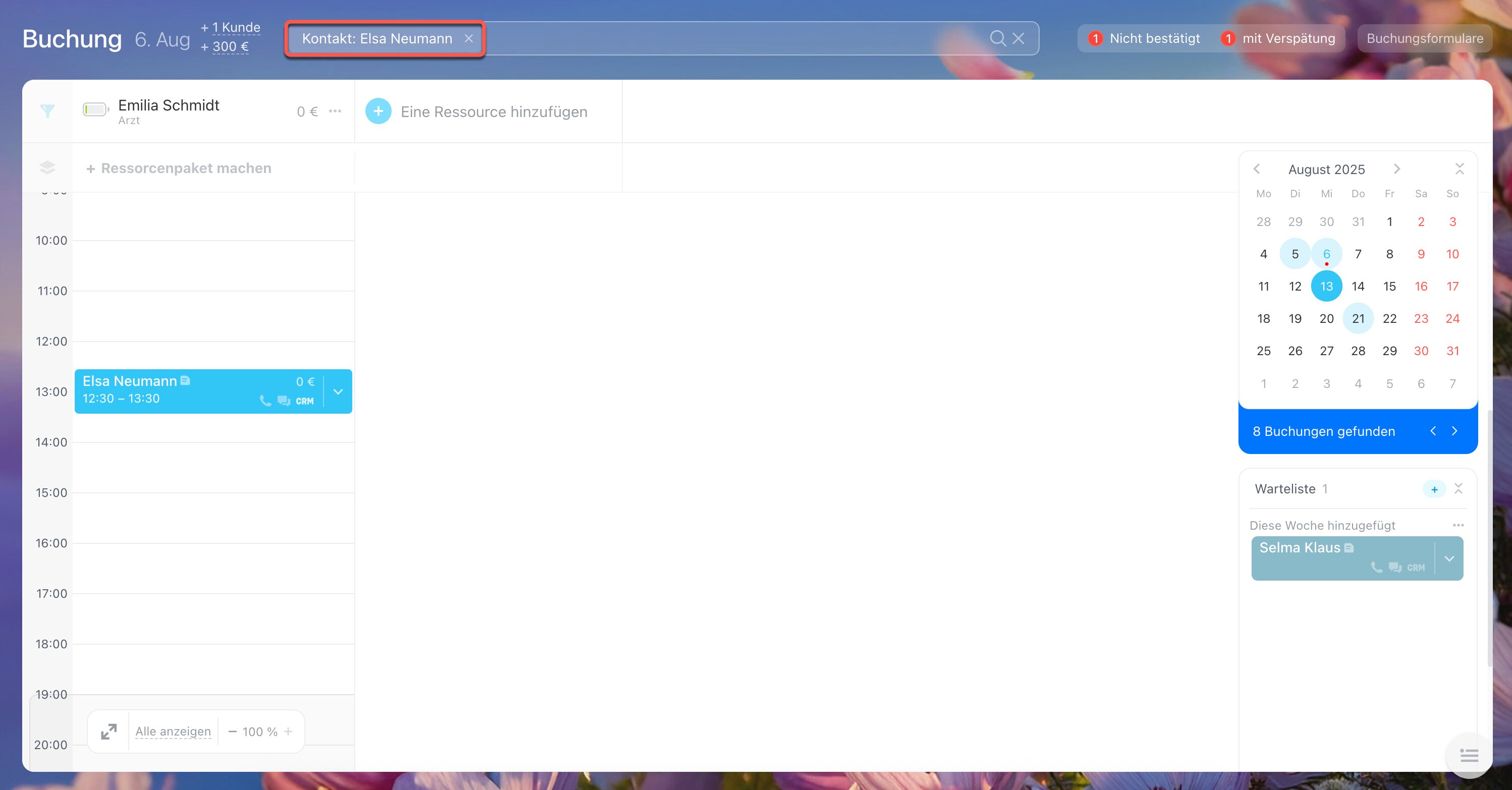 Beispiel: Wenden Sie den Filter „Kontakt“ an, um die Buchungen eines bestimmten Kunden für ein bestimmtes Datum anzuzeigen. Die Tage, an denen der Kunde weitere Termine hat, werden im Kalender hervorgehoben.