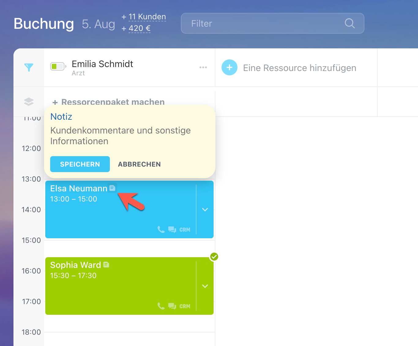 Klicken Sie auf das Notizsymbol, um persönliche Hinweise hinzuzufügen – z. B. Kundenpräferenzen oder besondere Wünsche.
