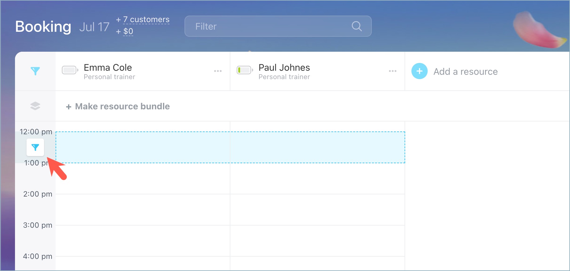 Nutzen Sie den Slot-Filter, um nur die Ressourcen anzuzeigen, die zu der ausgewählten Zeit verfügbar sind.