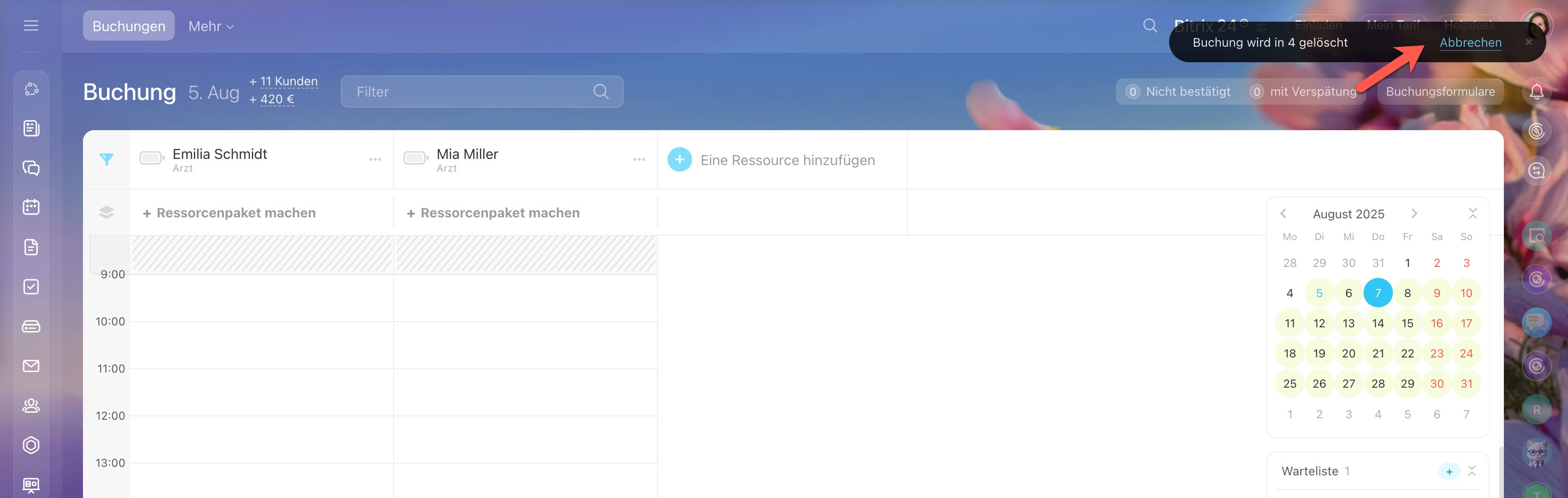 Wird eine Buchung versehentlich gelöscht, kann sie innerhalb von 5 Sekunden wiederhergestellt werden.