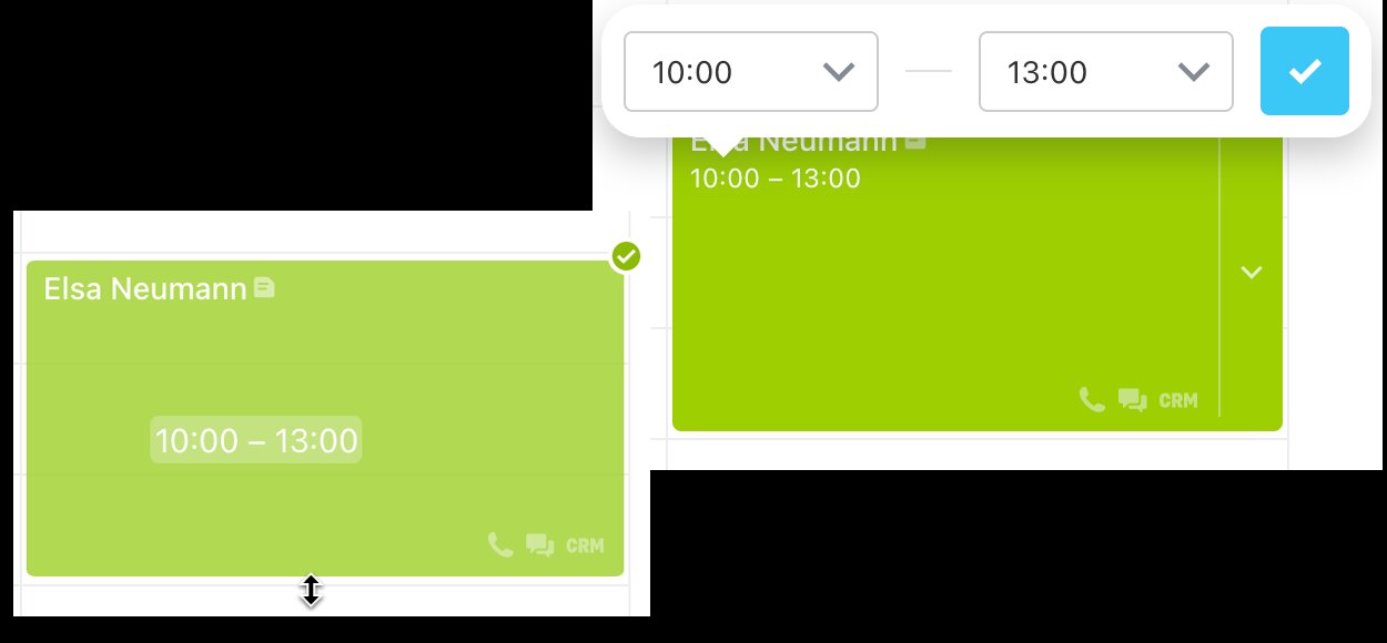 Ziehen Sie den Rand des Buchungsblocks, um die Dauer anzupassen, oder klicken Sie auf die Zeit im Block, um sie zu ändern.