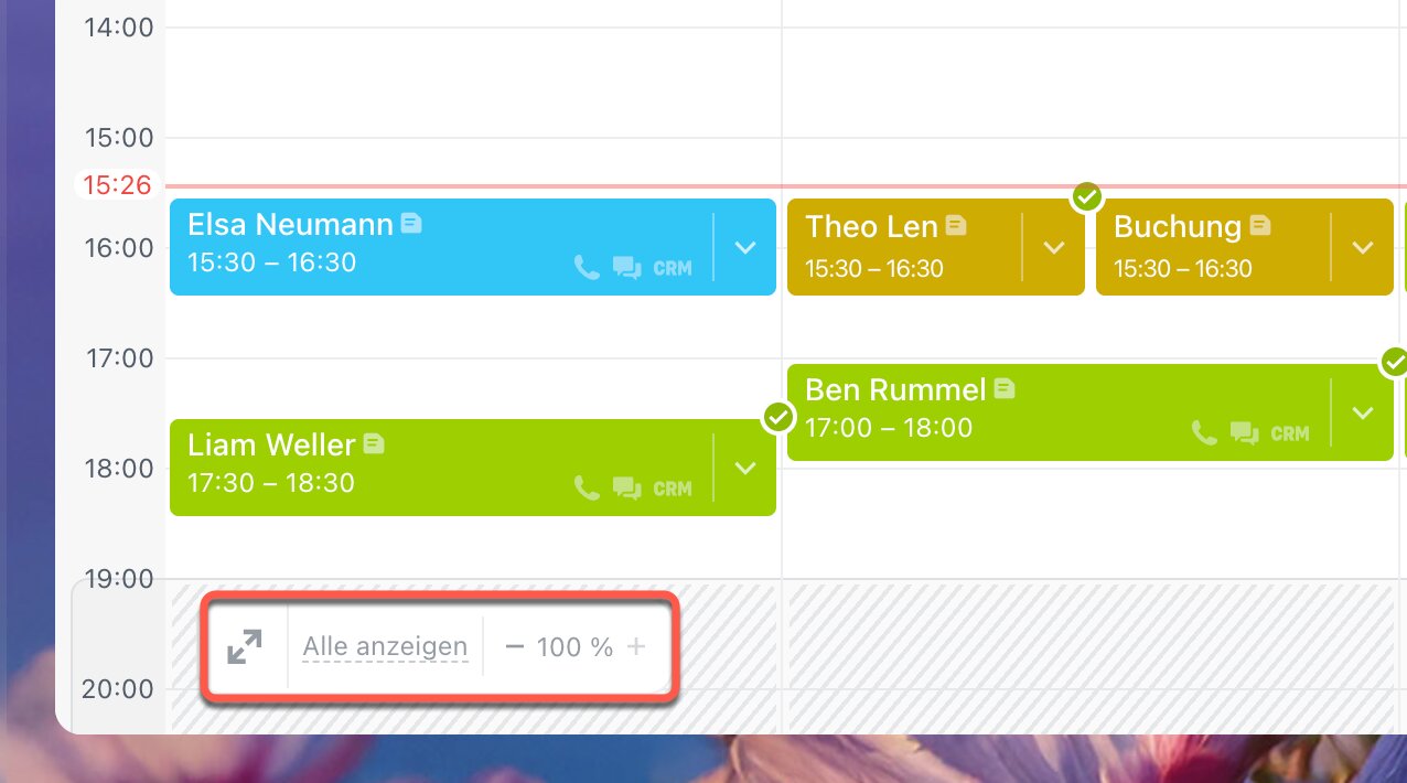 Wenn die Buchungen nicht alle auf dem Bildschirm Platz finden, passen Sie den Zoom an (z. B. von 100 % auf 150 % oder mehr). Drücken Sie den Button „Alle anzeigen, um alle Ressourcen einzublenden und deren Auslastung schnell zu überprüfen.