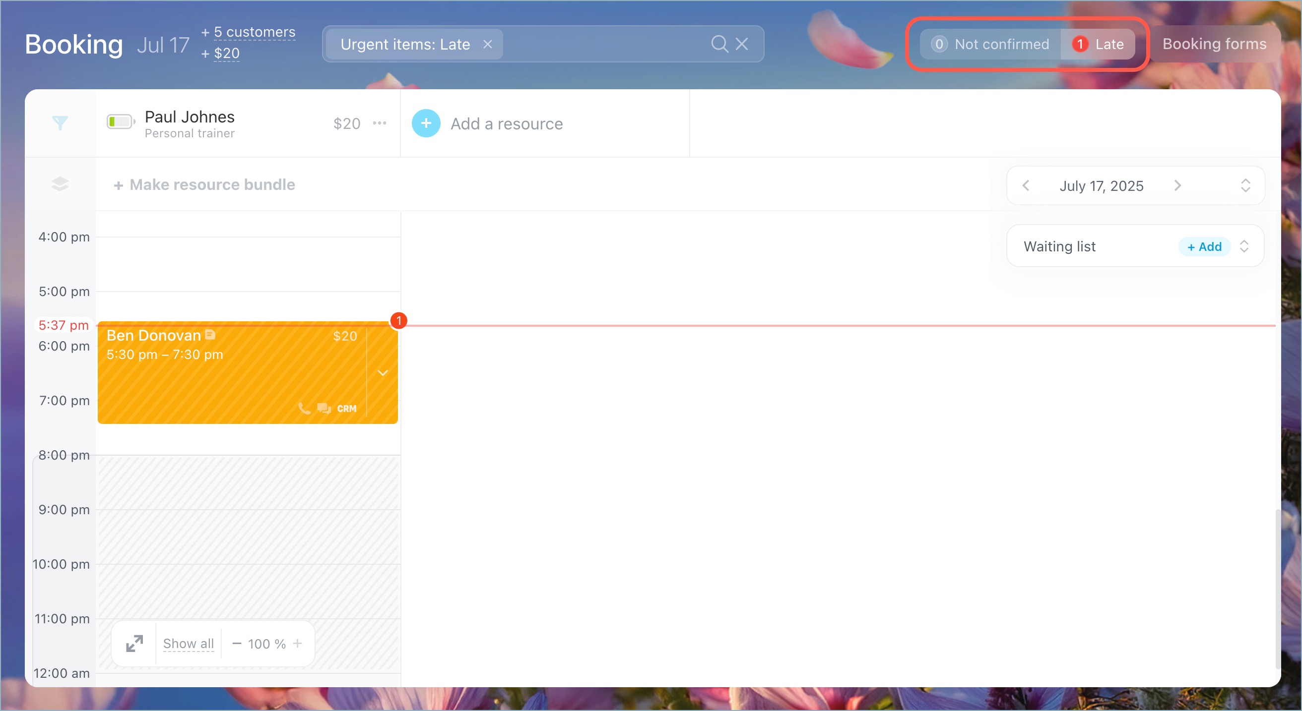 Wenn sich der Kunde verspätet, wird die Buchung in orange dargestellt – so fällt sie sofort auf. Sollte der Kunde den Termin gar nicht bestätigen, zeigt ein roter Zähler an, dass eine Aktion erforderlich ist. Der zuständige Mitarbeiter erkennt direkt, dass der Kunde kontaktiert werden sollte.