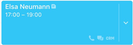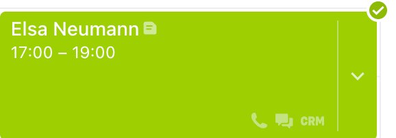 Sobald ein Kunde seine Buchung bestätigt hat, sehen Sie diese als grünen Eintrag mit Häkchen. Auch alle zugehörigen Aktivitäten in Aufträgen erscheinen dann auf dem grünen Hintergrund. Buchungen, die weniger als 24 Stunden vor dem Termin erstellt werden, sind automatisch bestätigt und werden ebenfalls grün angezeigt.