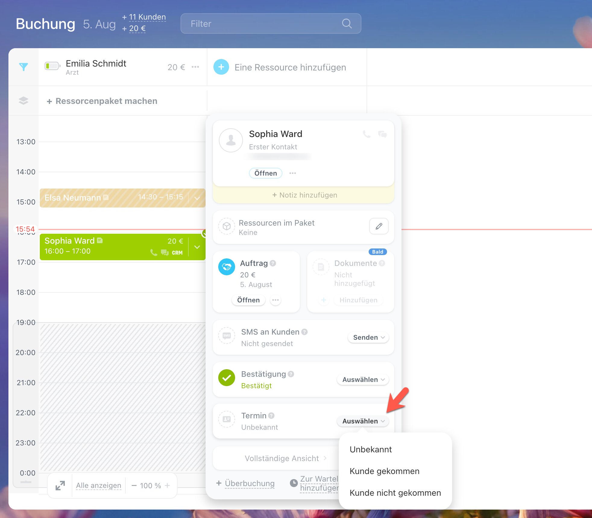 Um die Besuche im Terminplaner zu verfolgen, klicken Sie auf den Pfeil neben der Buchung, öffnen Sie die Liste im Block „Termin“ und setzen Sie den Status „Kunde gekommen“ oder „Kunde nicht gekommen“.
