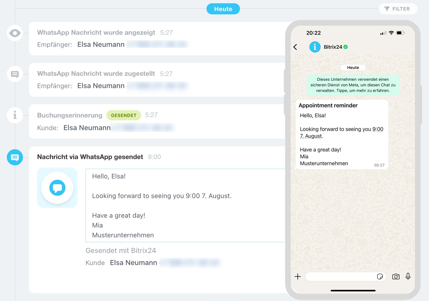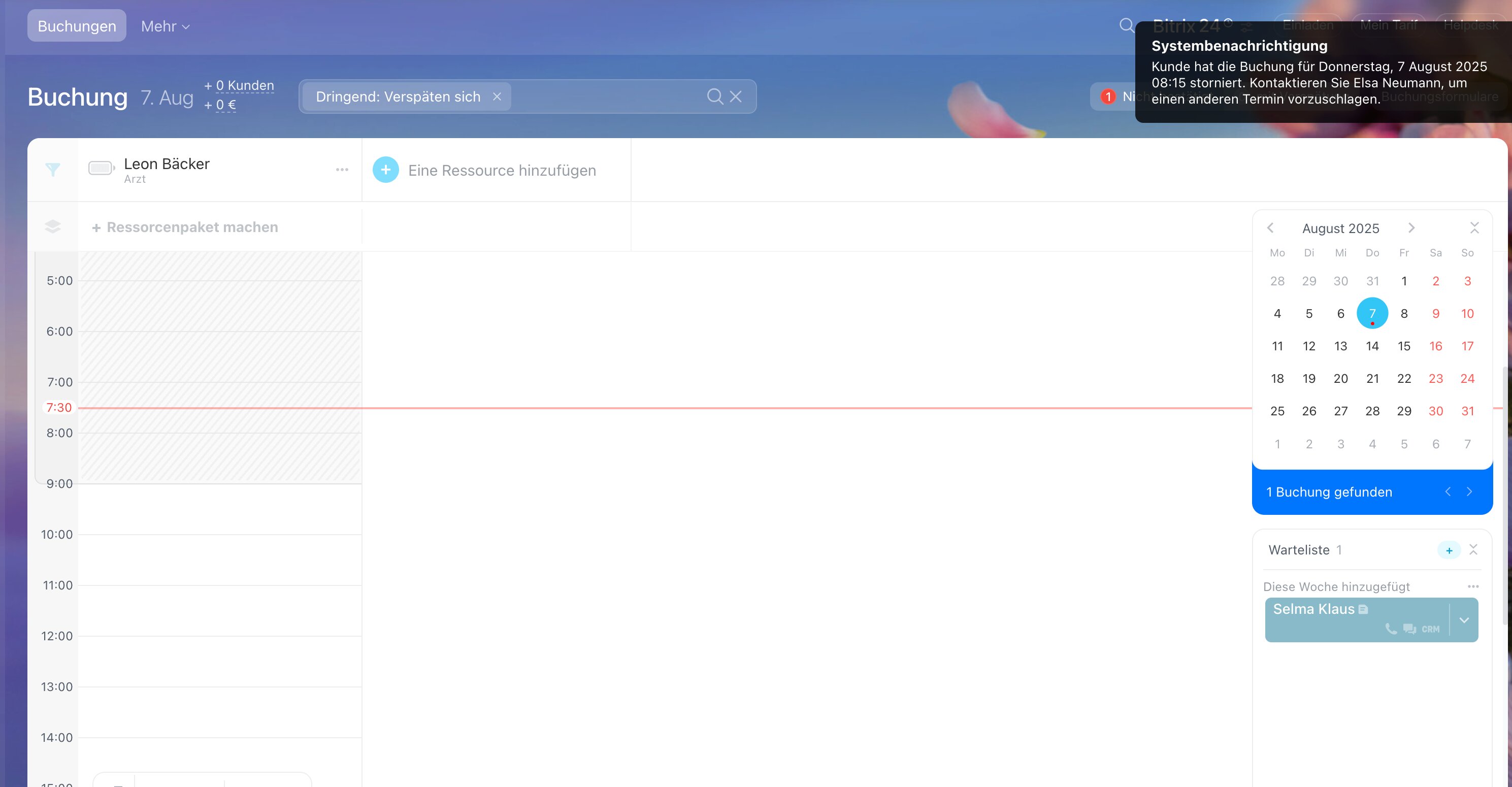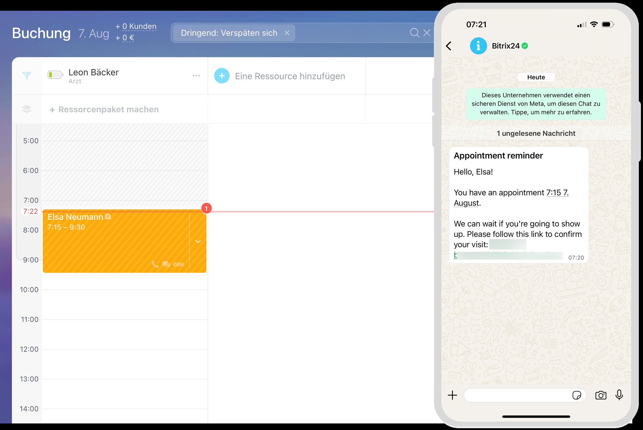 Wenn ein Kunde nicht pünktlich erscheint und der Termin vom Mitarbeiter noch nicht als bestätigt markiert wurde, sendet Bitrix24 automatisch eine Folgenachricht – entweder 5 oder 10 Minuten nach dem geplanten Start, je nach Ihren Einstellungen.