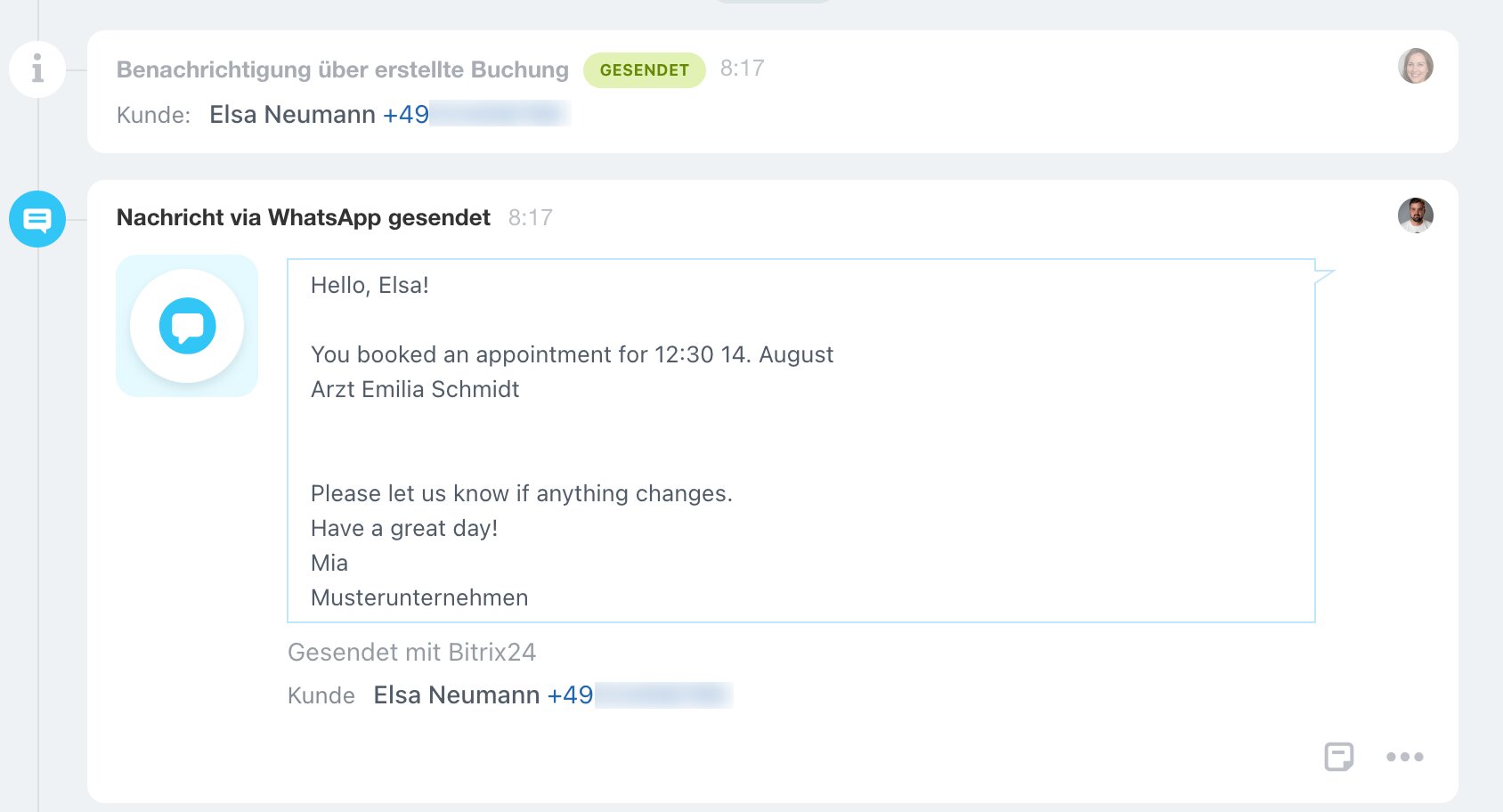 Im Auftragsformular wird die Buchung als Aktivität in der Timeline angezeigt, zusammen mit dem Nachrichtenverlauf. Dazu gehören auch die Status „gesendet“ und „gelesen“, damit Sie immer wissen, ob der Kunde die Nachricht erhalten hat.
