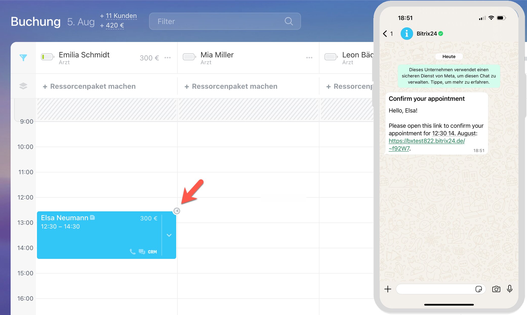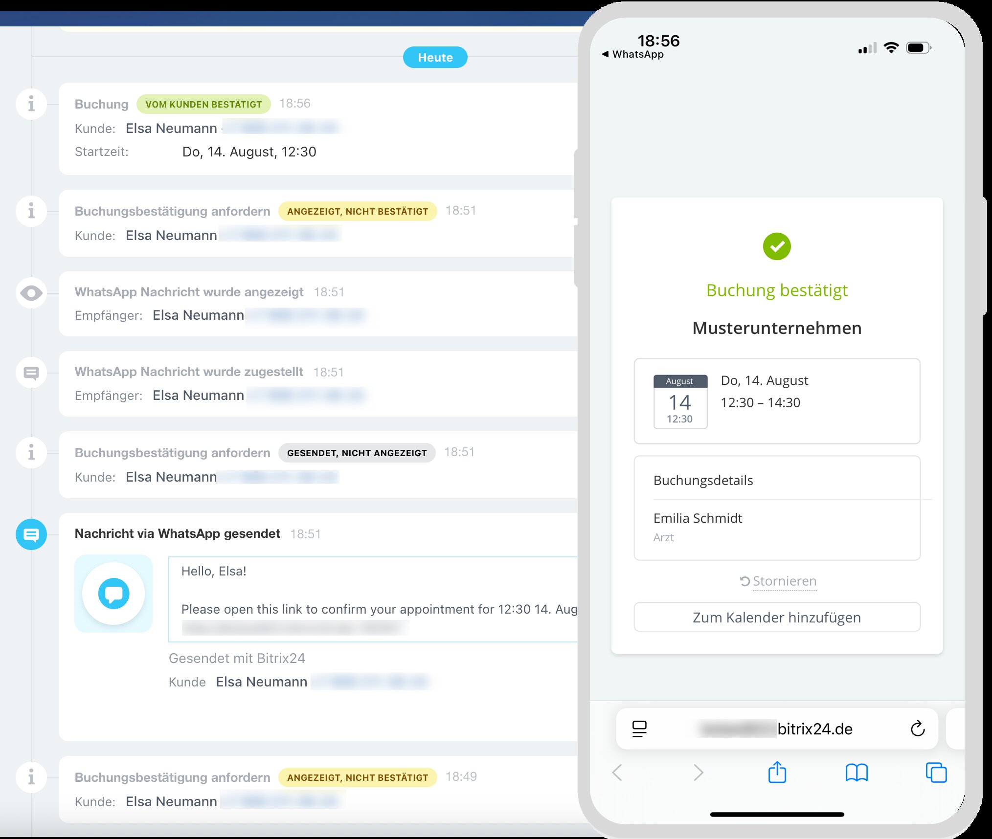 Wenn ein Kunde einen neuen Termin bucht, sendet Bitrix24 automatisch eine Bestätigungsnachricht mit Datum, Uhrzeit und Angaben zur Ressource. Sie können wählen, ob die Nachricht sofort, nach 10 Minuten oder nach einer Stunde gesendet wird.
