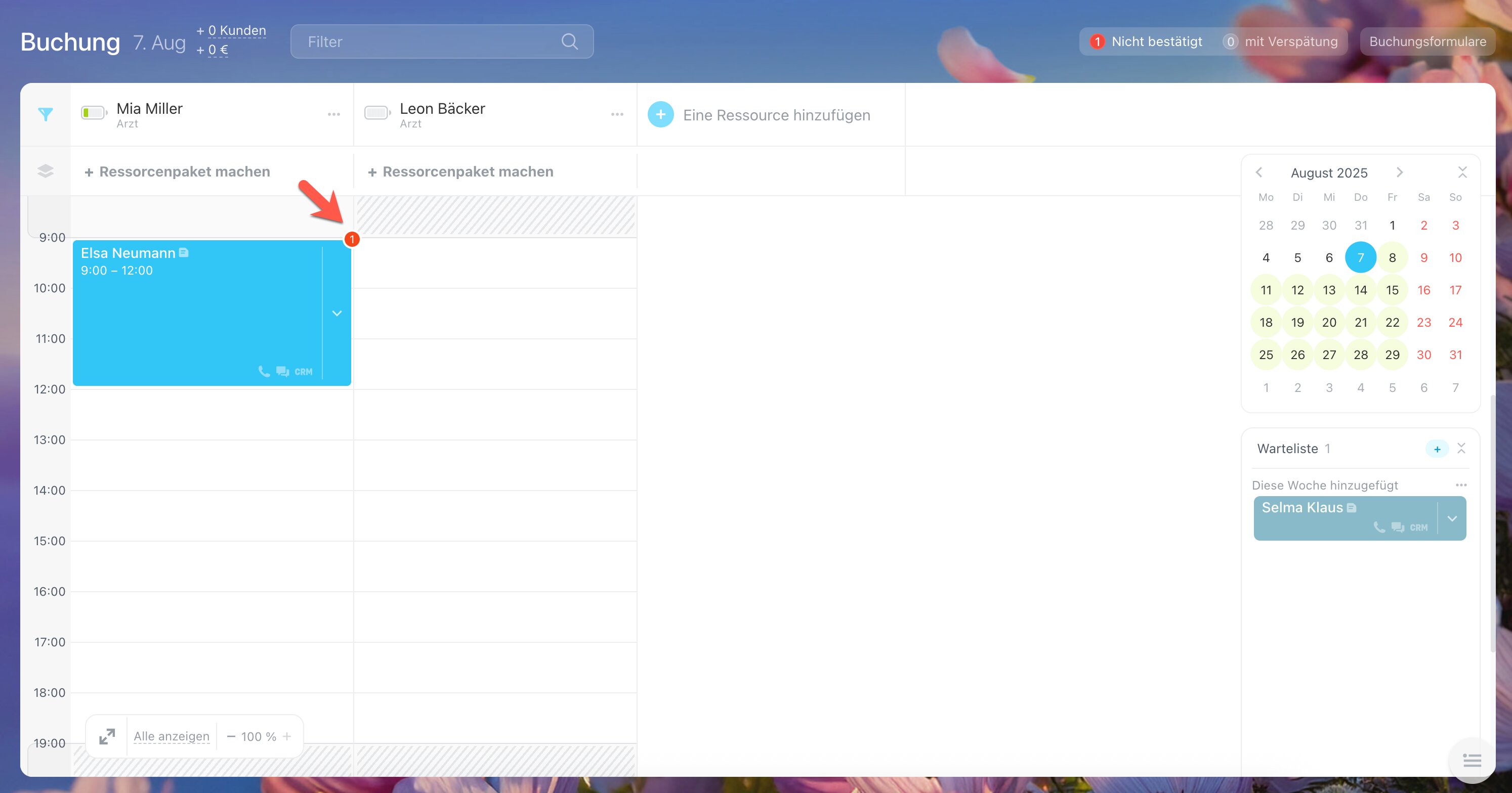 Wenn der Kunde den Termin über den Link nicht bestätigt, erscheint ein roter Zähler.