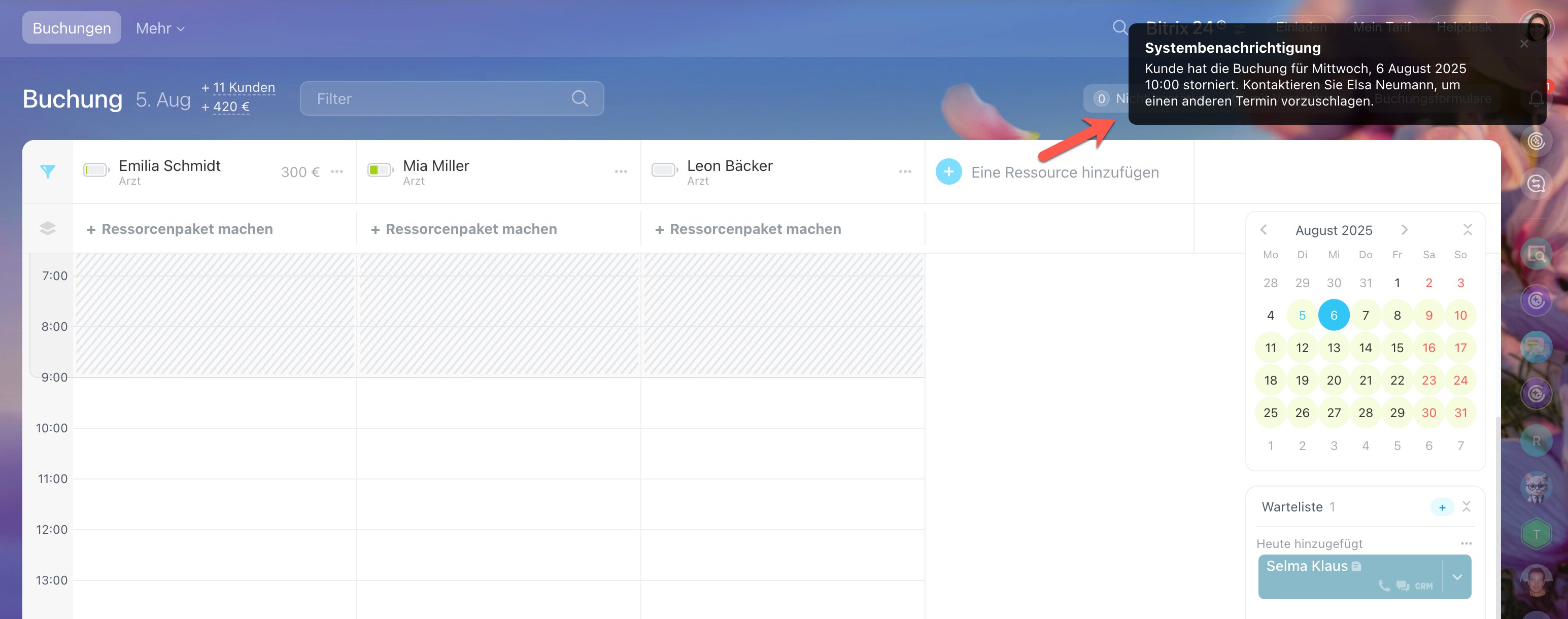Wenn der Kunde den Termin absagt, erhält der Mitarbeiter eine Benachrichtigung.