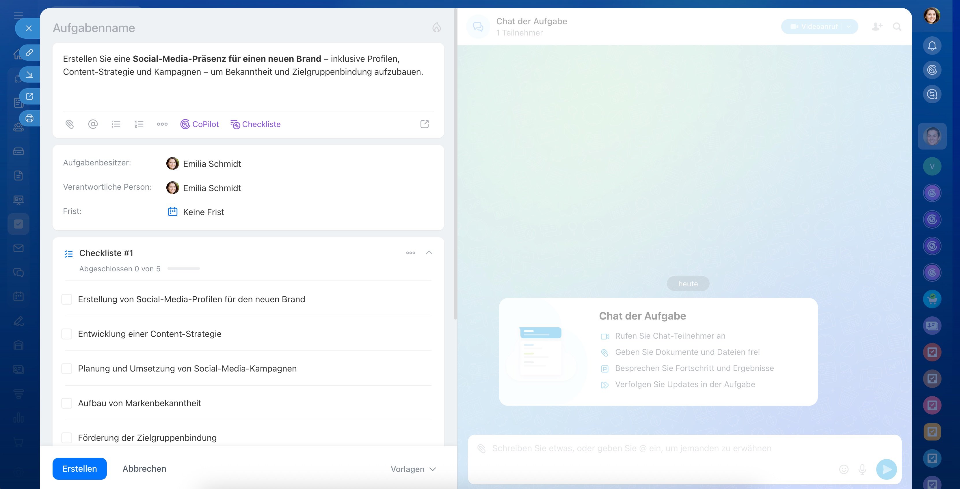 - Nutzen Sie CoPilot, um Aufgaben in Chats, Notizen, Collabs und Kanälen zu erstellen