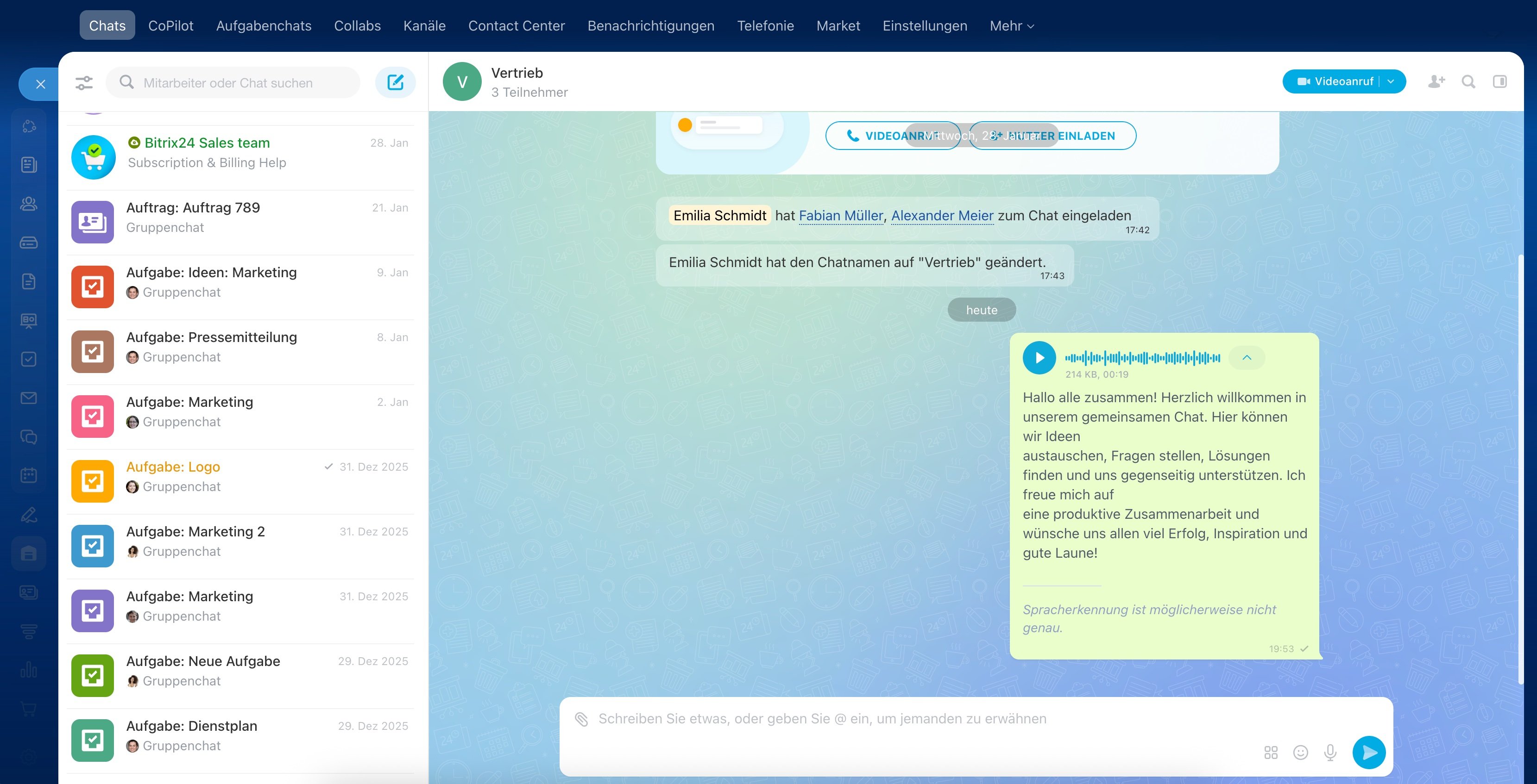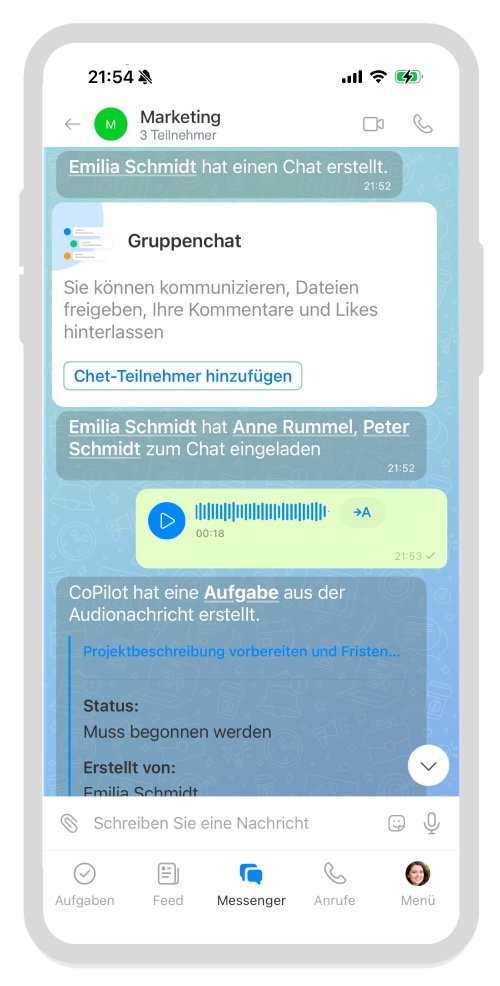 Wenn Sie oft Sprachnachrichten nutzen, unterstützt Sie CoPilot auch hier. Jede Sprachnachricht in einem Chat kann automatisch in Text oder Aufgaben umgewandelt werden. Das kann CoPilot für Sie tun: