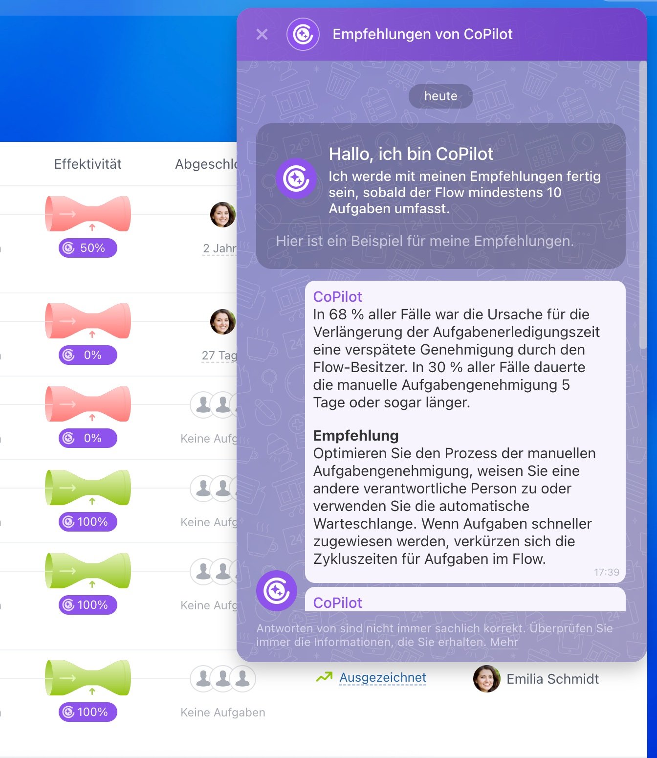 Wenn Sie Flows in Aufgaben nutzen, analysiert CoPilot Ihren ausgewählten Flow, deckt auch Schwachstellen und Ineffizienzen auf — und schlägt Ihnen konkrete Verbesserungen vor. Arbeitet Ihr Team besonders effektiv? Dann zeigt CoPilot Ihnen genau, was zum Erfolg beiträgt.