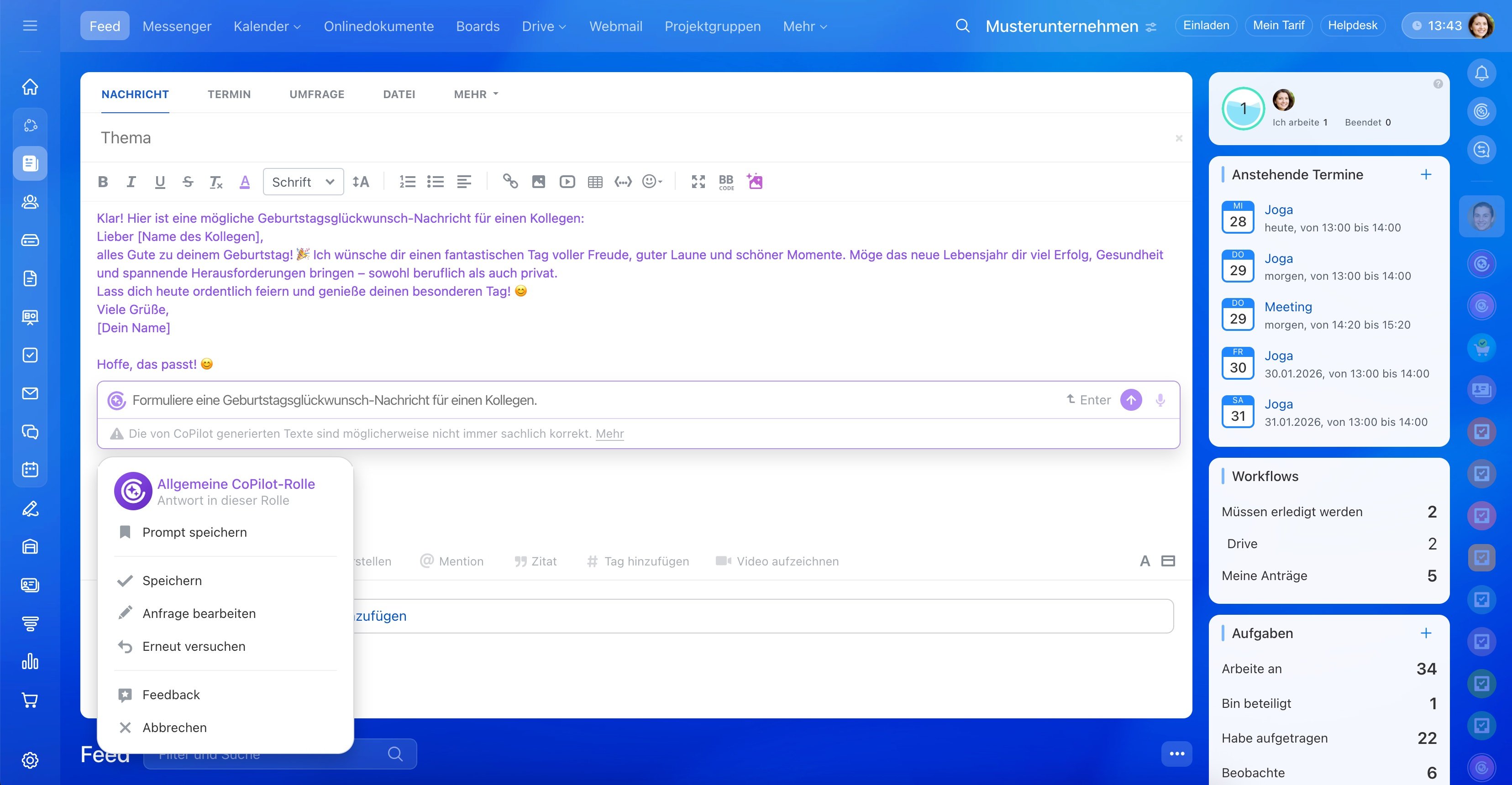 Im Feed von Bitrix24 hilft Ihnen CoPilot, aus einem Entwurf eine vollständige Nachricht zu machen oder sogar eine komplette Ankündigung in einem bestimmten Stil oder Ton zu verfassen. Darüber hinaus analysiert CoPilot Beiträge Ihrer Kollegen: fasst sie zusammen, hebt die Kernbotschaften hervor, vereinfacht komplexe Inhalte, übersetzt in verschiedene Sprachen und erledigt noch vieles mehr.