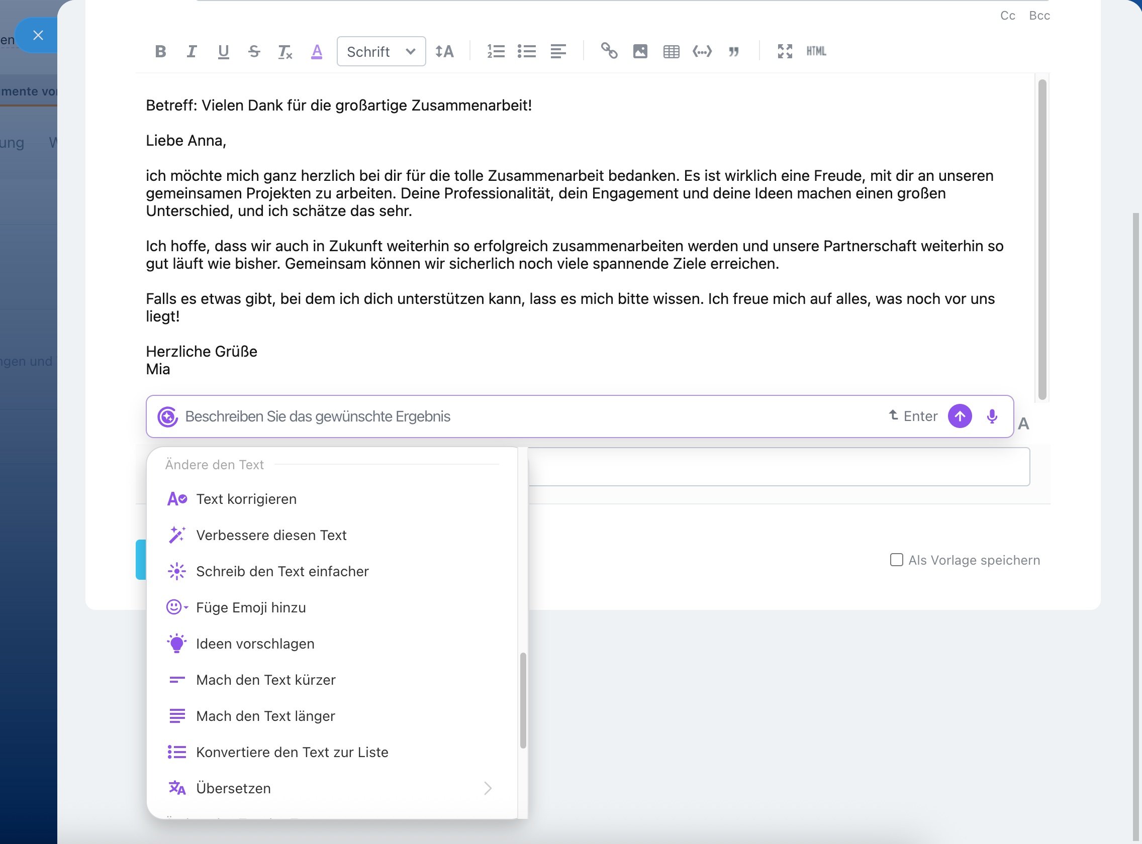 Hier können Sie CoPilot nutzen, um E-Mails an Kunden zu schreiben und zu beantworten, bestehende Texte zu kürzen oder zu erweitern, Angebote vorzubereiten und vieles mehr. Diese Funktionen stehen im Bereich „Webmail“ im Hauptmenü sowie direkt im CRM zur Verfügung.