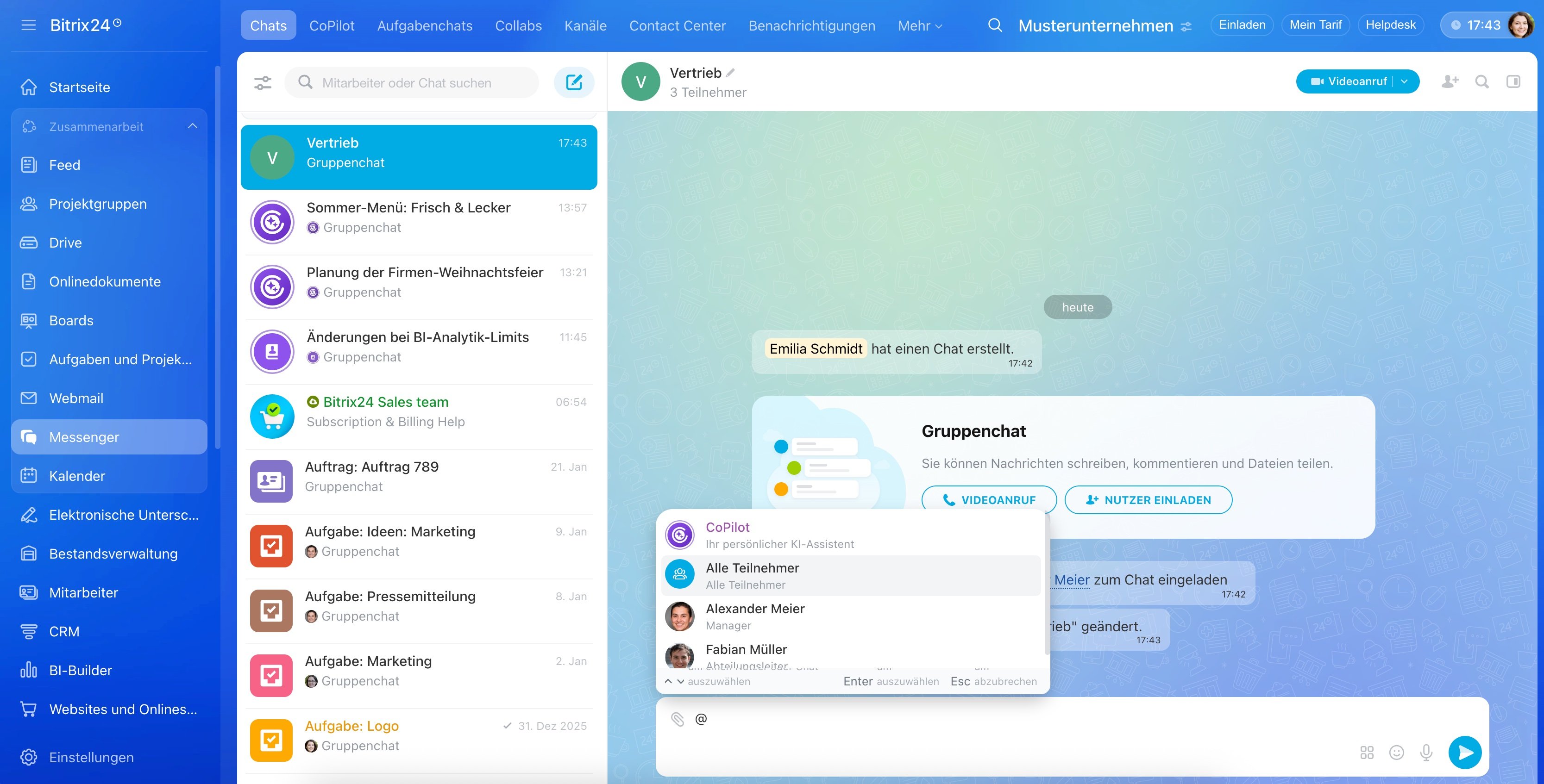 Interagieren Sie mit CoPilot direkt in Ihren Gruppen- oder privaten Chats im Bitrix24-Messenger. Besonders nützlich, wenn Sie nach Urlaub oder Krankheit den Anschluss wiederfinden, lange Diskussionen zusammenfassen oder neue Teammitglieder einarbeiten möchten.