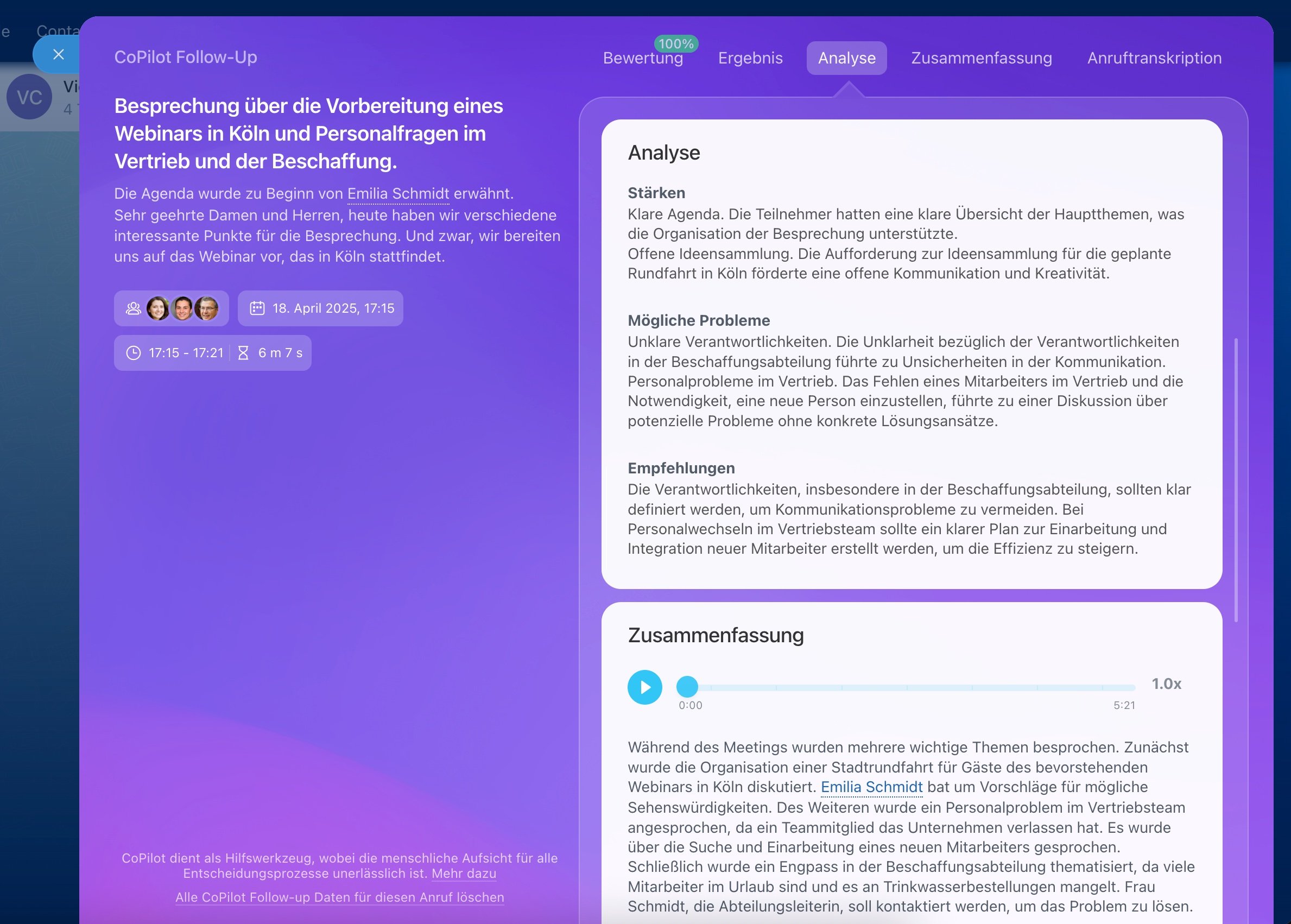 CoPilot Follow-Up fungiert als Ihr persönlicher Assistent, der den Anruf transkribiert und eine detaillierte Analyse erstellt.