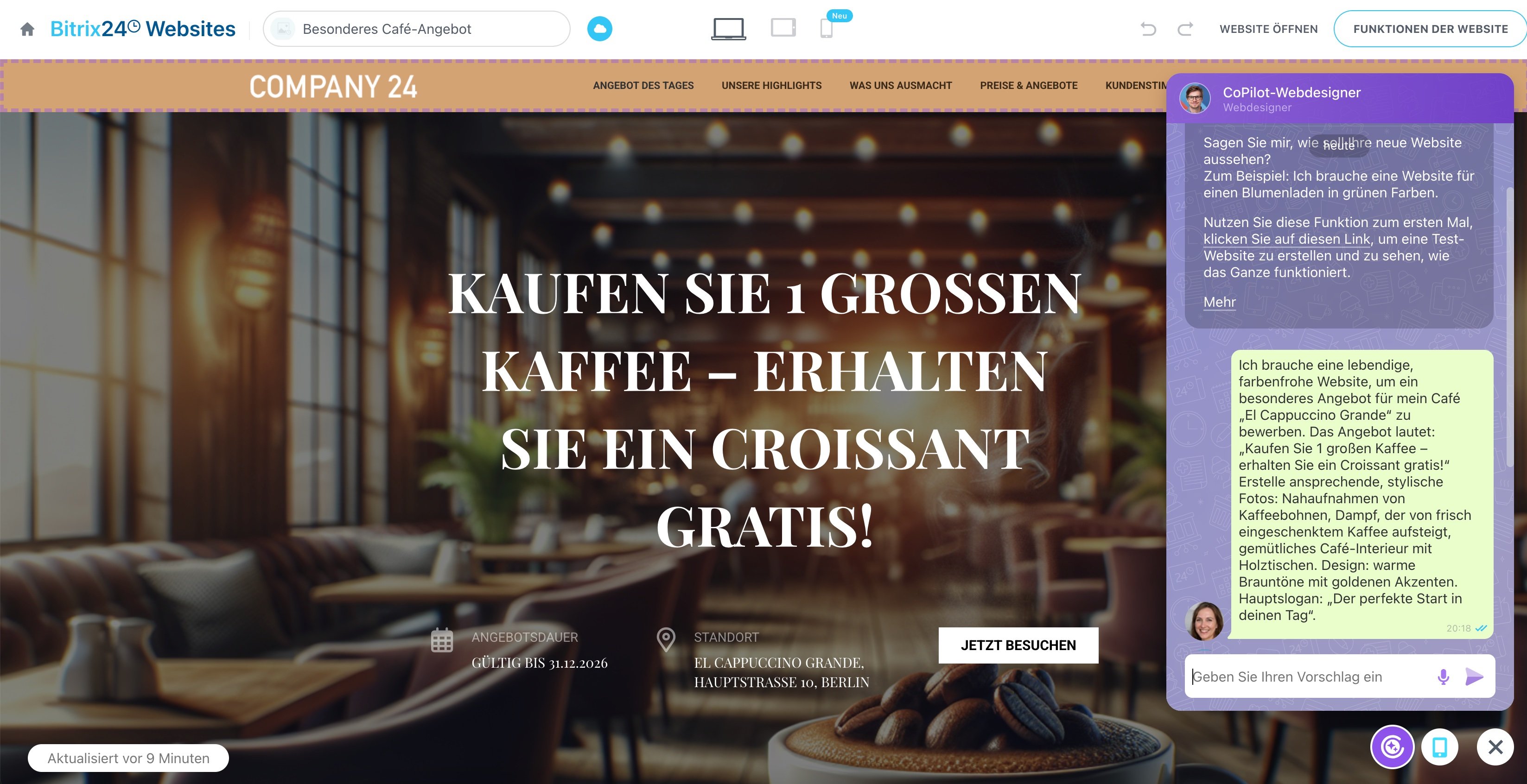 Statt Ihre Website oder Landingpage mühsam Schritt für Schritt von Grund auf aufzubauen, können Sie mit CoPilot in wenigen Minuten eine fertige Webseite erhalten – komplett mit KI-generierten Bildern, Texten und professioneller Struktur, alles aus einem einzigen Prompt generiert. Beschreiben Sie einfach, welche Art von Website Sie brauchen (direkt im CoPilot-Prompt), und unsere KI erstellt das passende Design, Bilder und Texte. Dabei sind keine Programmier- oder Designkenntnisse erforderlich! Sobald die Website erstellt ist, können Sie die einzelnen Blöcke ebenfalls mit CoPilot bearbeiten und anpassen.