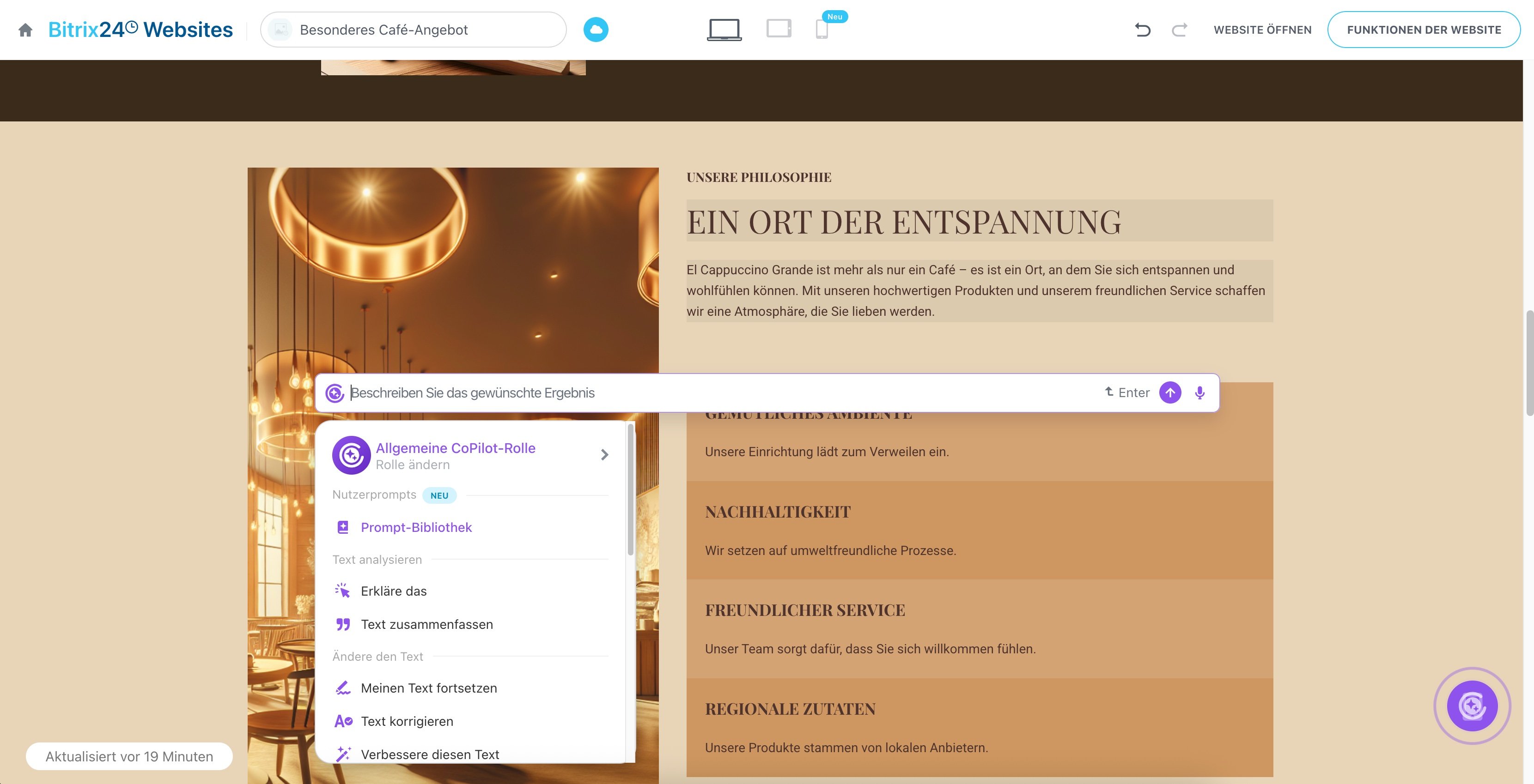Jede Website, die Sie mit CoPilot erstellen, lässt sich ganz einfach bearbeiten und anpassen, bis Sie mit dem Endergebnis wirklich zufrieden sind. Wählen Sie einfach einen beliebigen Block aus und schreiben Sie im geöffneten Chat mit CoPilot, was Sie daran ändern möchten.