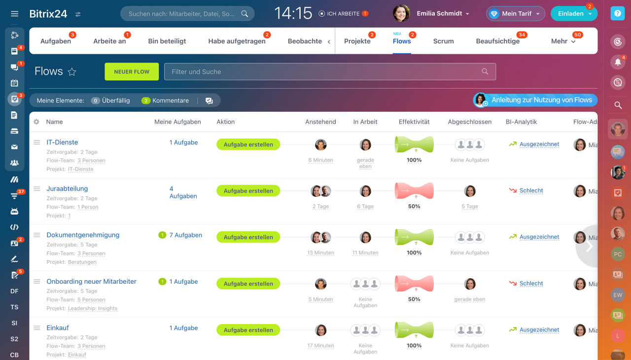 Zusammengefasst lässt sich sagen, dass die Verwendung von Flows in Bitrix24 folgende Vorteile anbietet: Sie beseitigen das Chaos und organisieren Ihren Aufgabenverwaltungsprozess. Die Einstellungen sind einfach und erfordern keine technischen Kenntnisse Flows schaffen einen klaren Überblick über die Arbeitsbelastung Ihrer Mitarbeiter und Abteilungen, was Ihnen hilft, sie effizient zu managen Die Engpässe und Verzögerungen werden sofort identifiziert, indem Sie die Flow-Effektivität in Echtzeit verfolgen. Sie erhalten die Möglichkeit, die Aufgabenfluss manuell oder automatisch zu verwalten. Das Tool liefert konkrete Belastungsdaten für jede Abteilung.