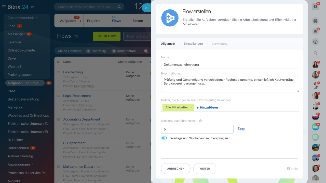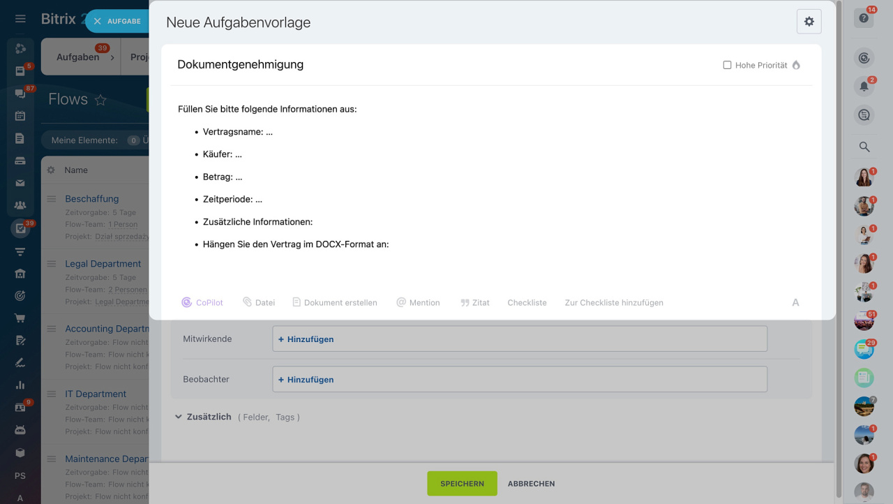 Als Beispiel nehmen wir den Prozess der Genehmigung von Kaufverträgen und anderen rechtlichen Dokumenten und erstellen unseren ersten Flow in Bitrix24. Dafür sind nur 4 einfache Schritte nötig.