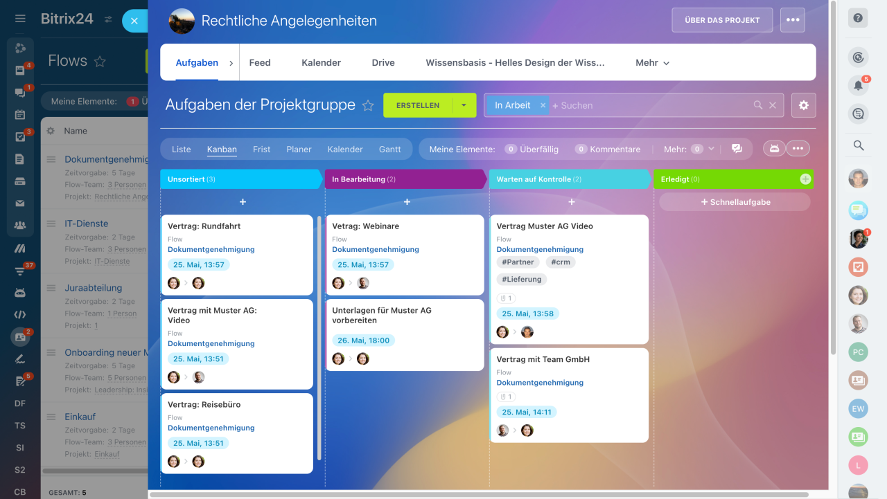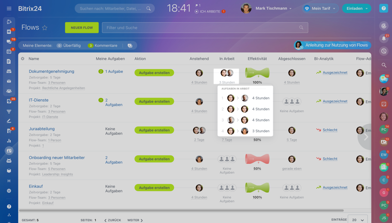 Flows in Bitrix24 ermöglichen es Managern, die Effektivität der Abteilungen schnell und unkompliziert zu bewerten, Engpässe zu erkennen, und bieten Einblicke in mögliche Strategien zur Steigerung der Produktivität.
