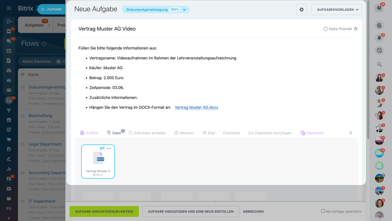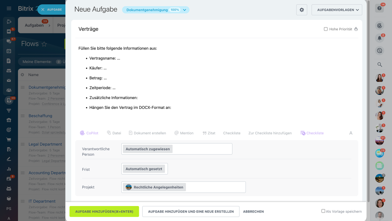 Jetzt ist es nicht nötig, sich Gedanken über die verantwortlichen Personen und Fristen zu machen — wenn Sie eine Aufgabe zum Bitrix24-Flow hinzufügen, füllt das System diese Felder automatisch aus.