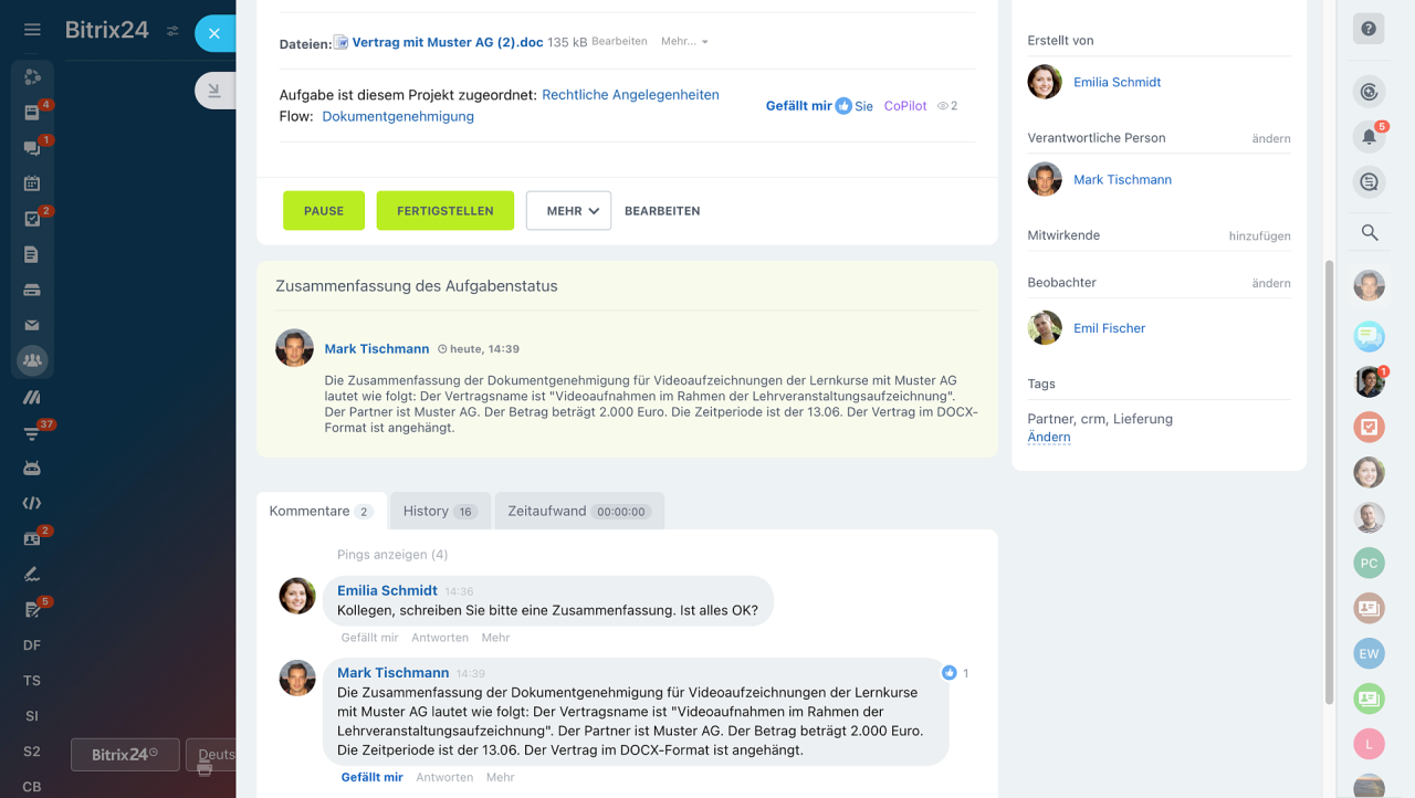 Wie Sie vielleicht wissen, sind Aufgaben in Bitrix24 mehr als nur Fristen und Verantwortliche. Sie können auch andere Teammitglieder als Teilnehmer und Beobachter einladen, um aufgabenbezogene Fragen in Kommentaren, im Chat oder im Videoanruf zu besprechen. Wenn die Aufgabe abgeschlossen ist, können Sie eine Zusammenfassung des Aufgabenstatus liefern, was dem Ersteller der Aufgabe die Bewertung erleichtert.