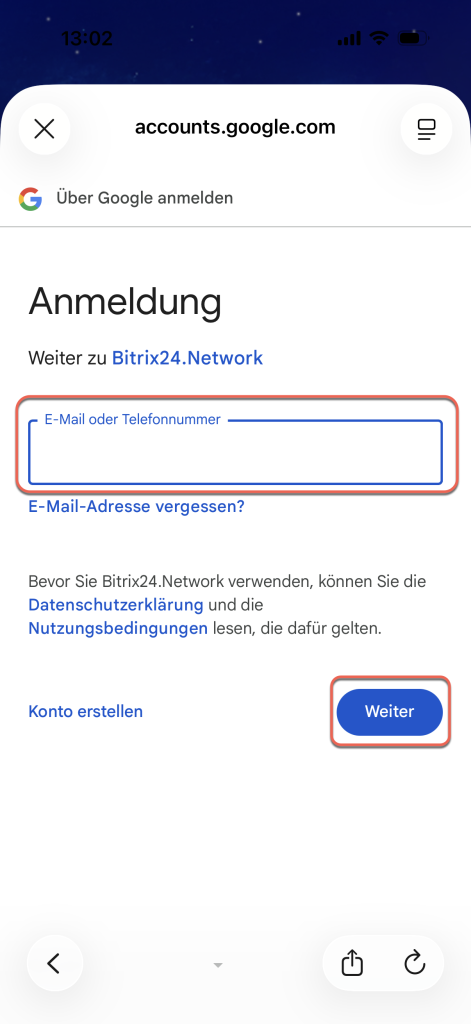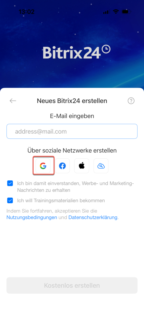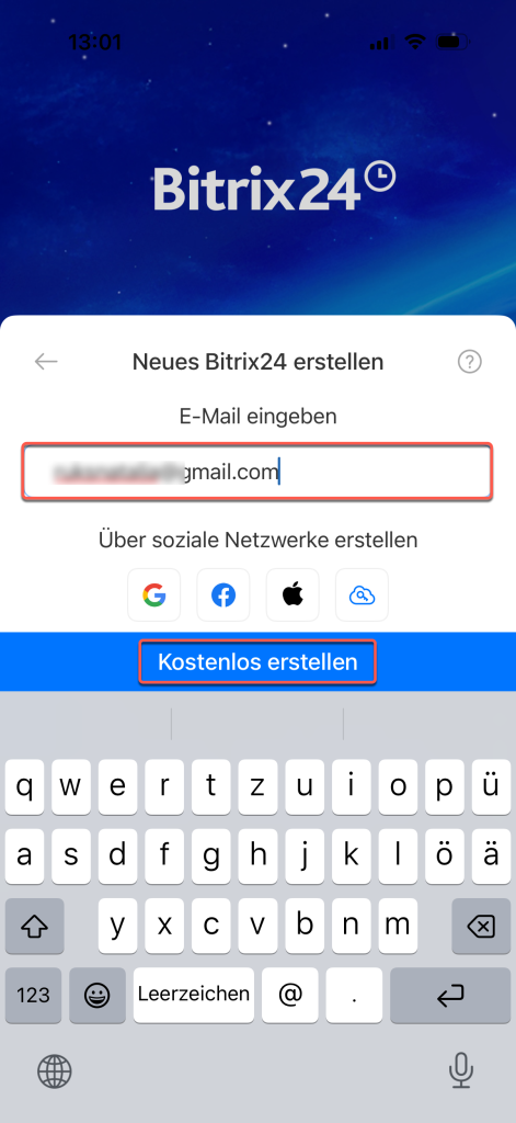 Sie können Bitrix24 direkt in der mobilen App erstellen – ideal, wenn Sie schnell und ohne Computer starten möchten.