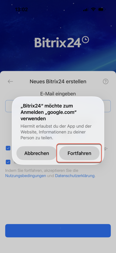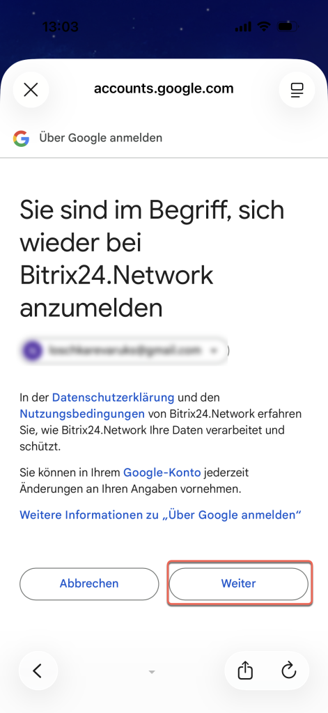 Erlauben Sie der Bitrix24-App, Daten aus Ihrem Konto zu verwenden. Klicken Sie auf Fortfahren.