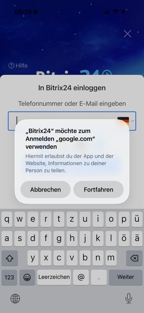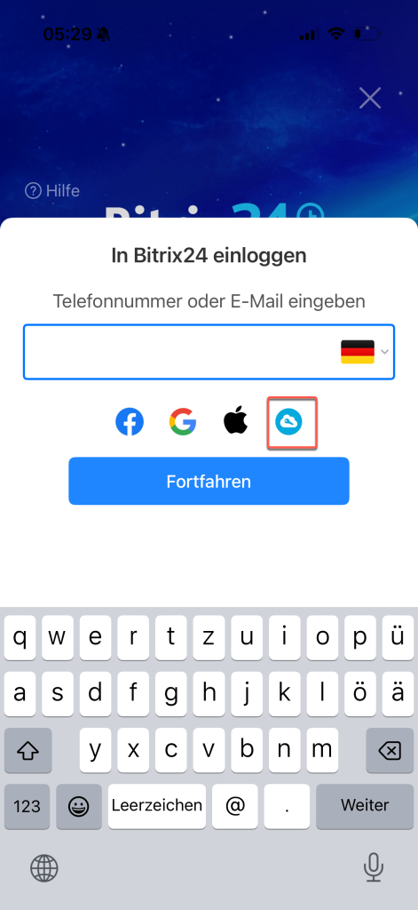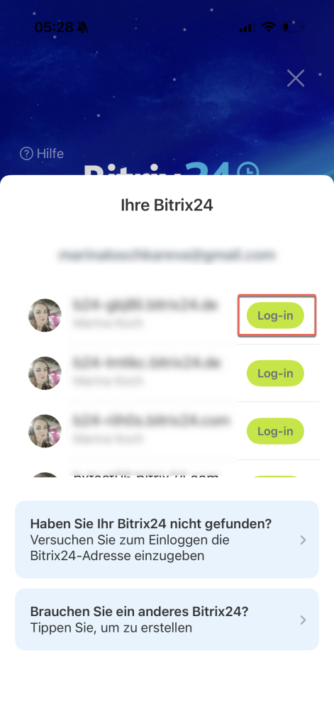 Wenn Sie mehrere Bitrix24 haben, können Sie auswählen, in welchem Account Sie sich anmelden möchten.