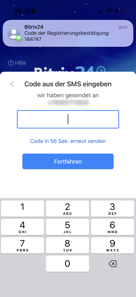 Telefonnummer. Geben Sie die Telefonnummer ein und Bitrix24 sendet Ihnen eine SMS mit dem Anmeldecode.
