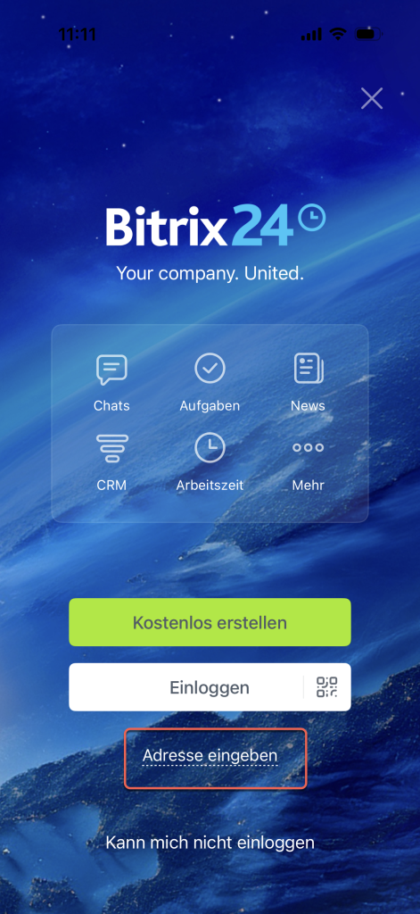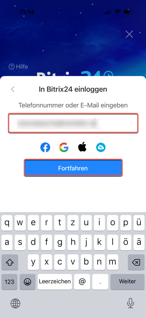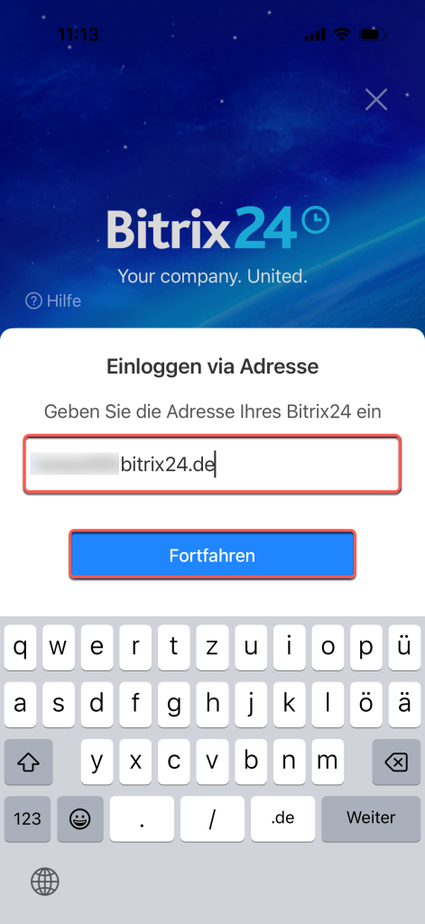 Geben Sie die Adresse Ihres Bitrix24 ein, z. B. mycompany.bitrix24.de oder crm.mycompany.de. Tippen Sie auf Fortfahren.