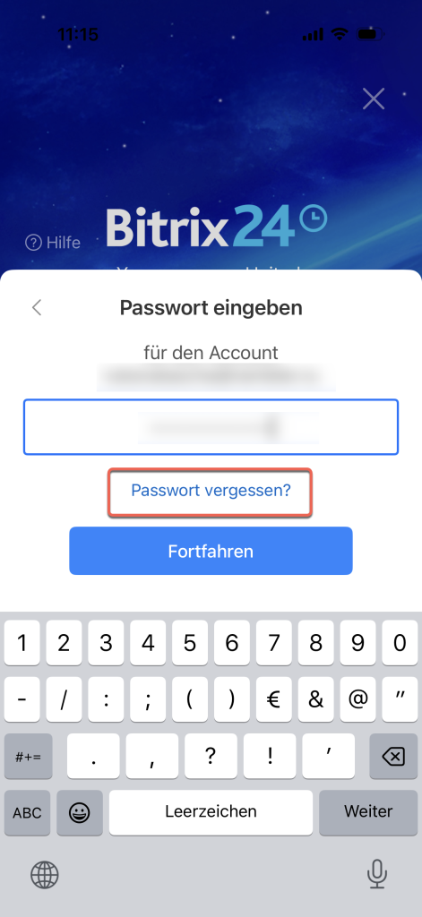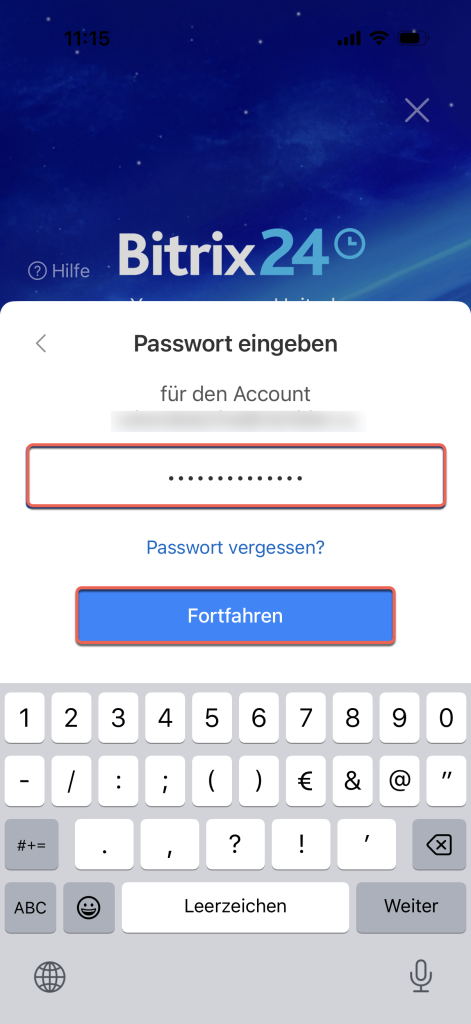 Geben Sie Ihr Passwort ein und tippen Sie auf Fortfahren. Danach öffnet sich Ihr Bitrix24.