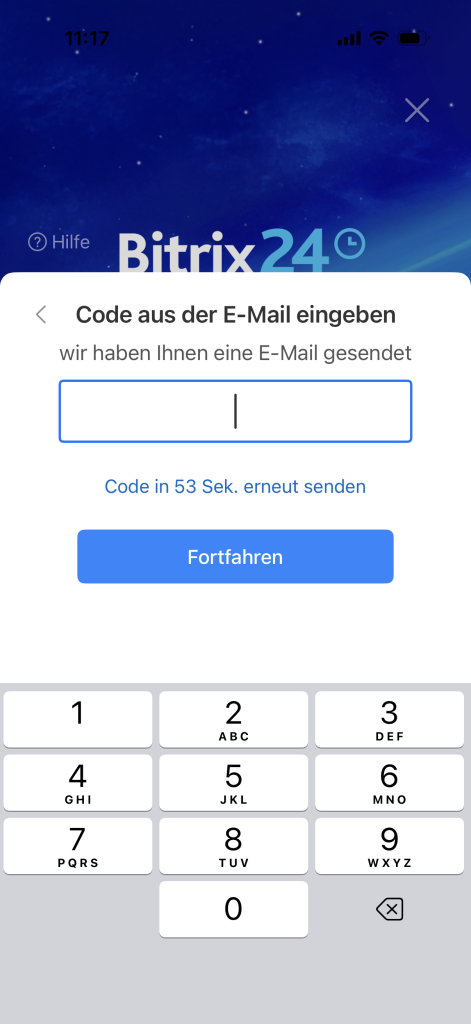 Geben Sie den Code aus der E-Mail ein. Danach werden Sie automatisch in Ihr Bitrix24 eingeloggt.