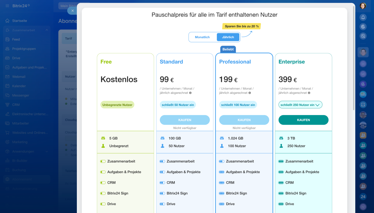 Innerhalb Ihres Bitrix24-Accounts können Sie Ihren Tarif downgraden und upgraden. Die Möglichkeit finden Sie im Bereich Abonnement > Upgraden > Wählen Sie einen Bitrix24 Tarif.