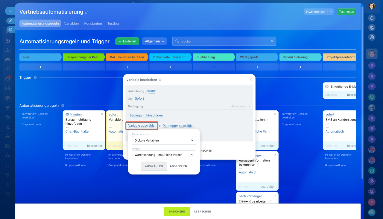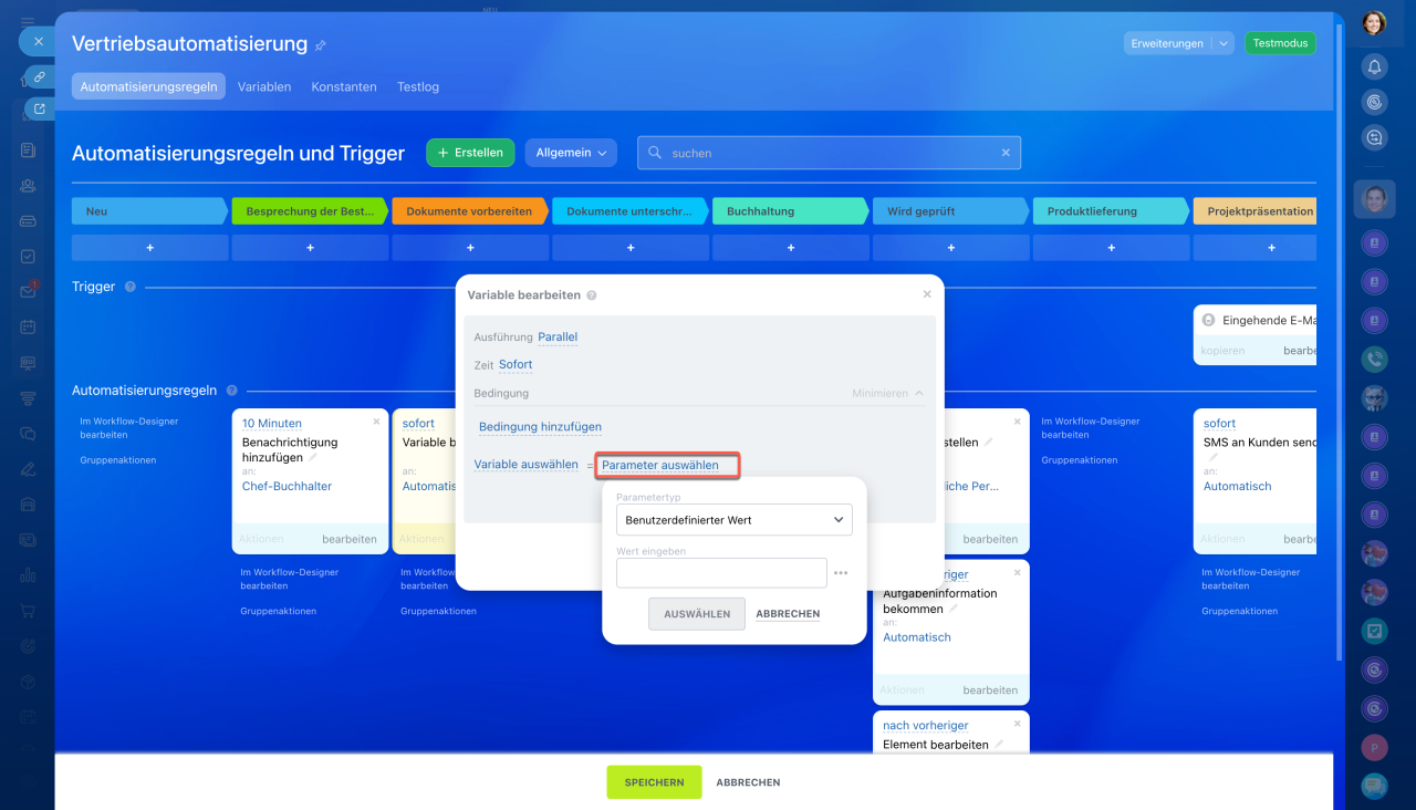 Geben Sie den Parameter für die Variable an. Das kann der Wert einer Konstante, einer anderen Variable oder der Wert eines Feldes aus dem CRM sein. Wenn Sie einen willkürlichen Wert angeben möchten, wählen Sie die Variante Benutzerdefinierter Wert aus.