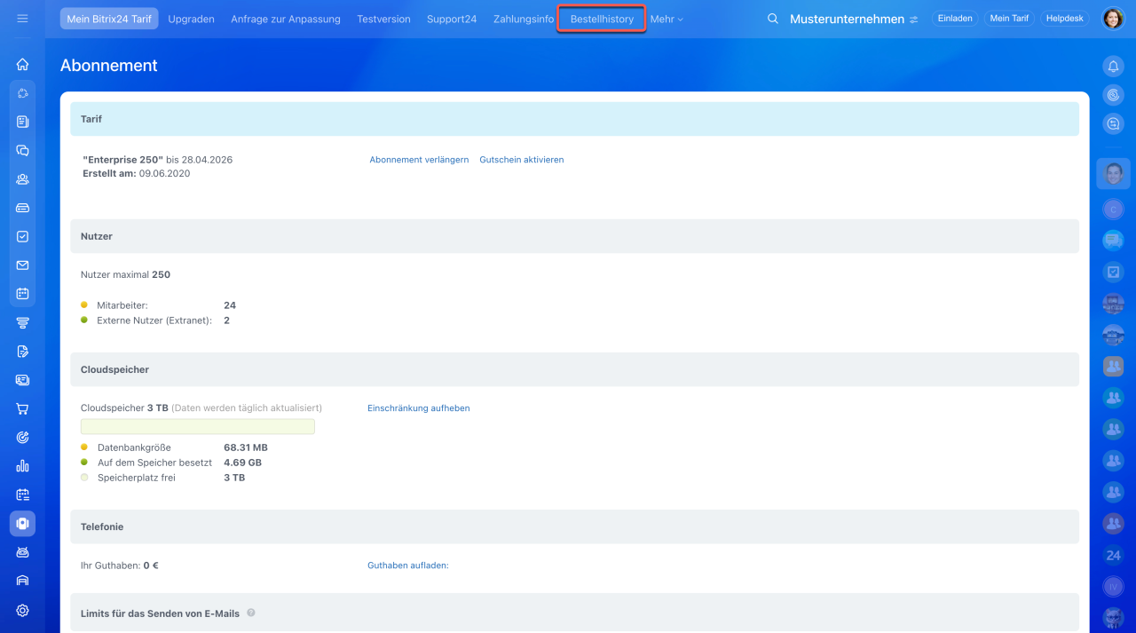 - Wenn der Status der Verlängerung Cancelled ist, bedeutet dies höchstwahrscheinlich, dass Bitrix24 bereits mehrmals erfolglos versucht hat, die Zahlung abzubuchen. Um ein neues Abonnement zu erwerben, gehen Sie auf Abonnement > Upgraden.
