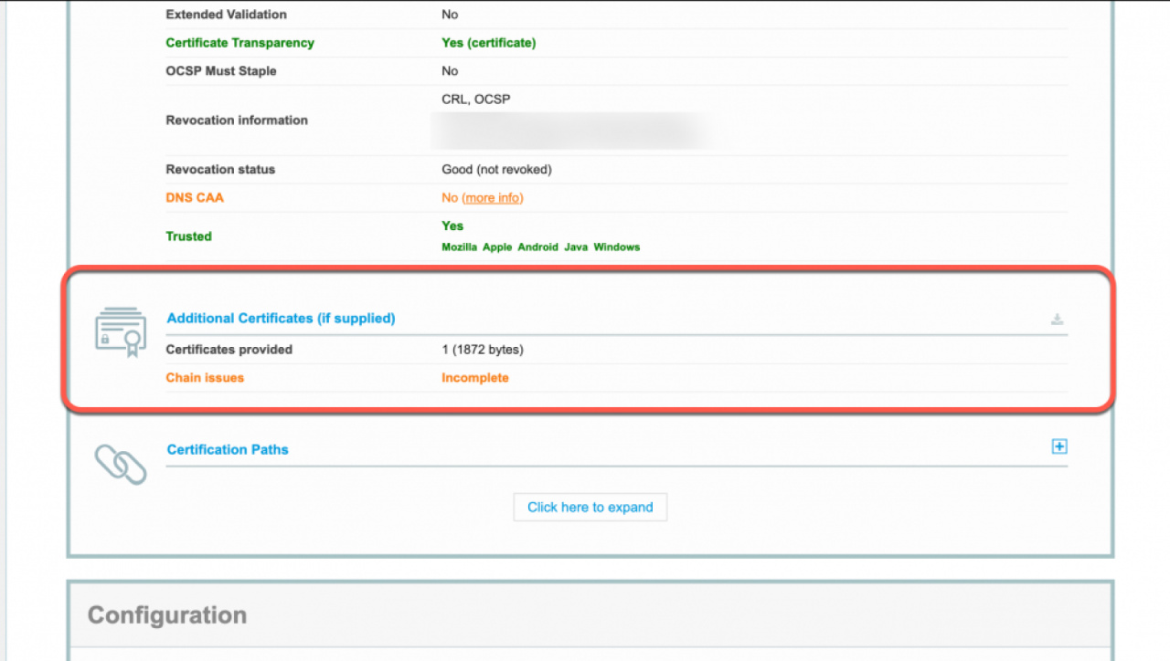 Suchen Sie das Feld Additional Certificates (if supplied). Wenn dort die Warnung Chain issues angezeigt wird, konfigurieren Sie den Server so, dass das Zwischenzertifikat in die Zertifikatskette aufgenommen wird. Weitere Informationen erhalten Sie beim Anbieter des SSL-Zertifikats.