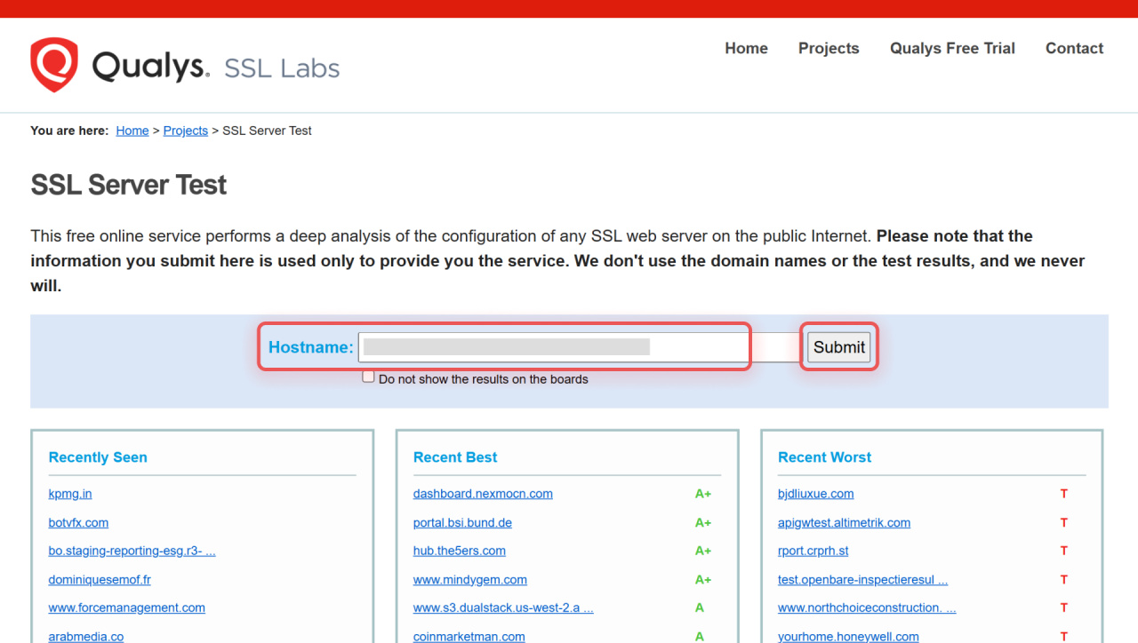 Zur Überprüfung der SSL/TLS-Konfiguration können Online-Tools wie Qualys SSL Labs verwendet werden. Öffnen Sie die Diagnoseseite. Geben Sie im Feld Hostname die Serveradresse ein und klicken Sie auf Submit.