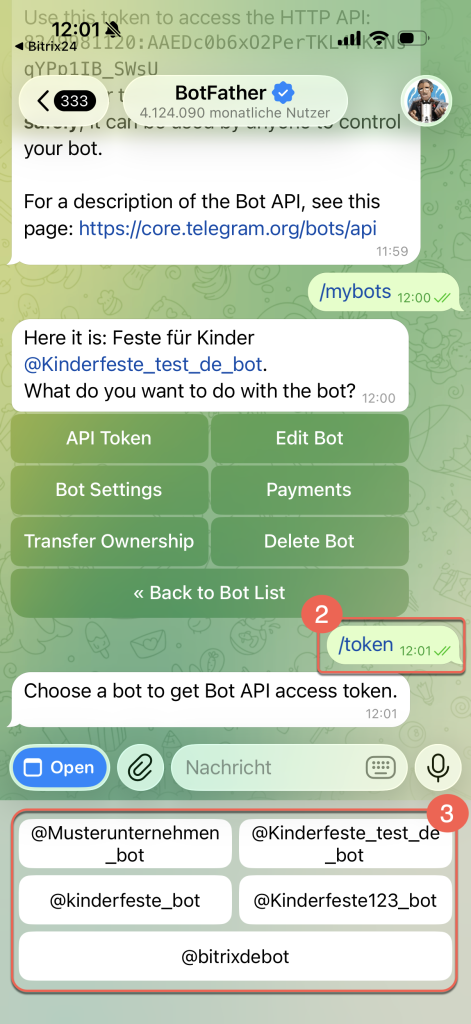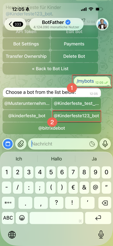 1–2. Geben Sie den Befehl /mybots ein und wählen Sie den Bot aus.