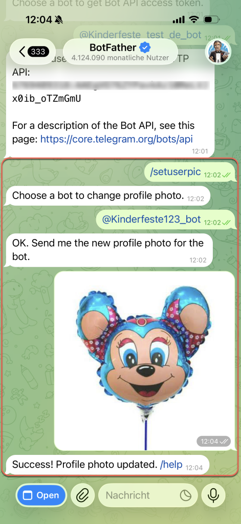 Bild des Bots festlegen. Geben Sie den Befehl /setuserpic ein, geben Sie den Namen Ihres Bots an und senden Sie ein Bild im Chat.