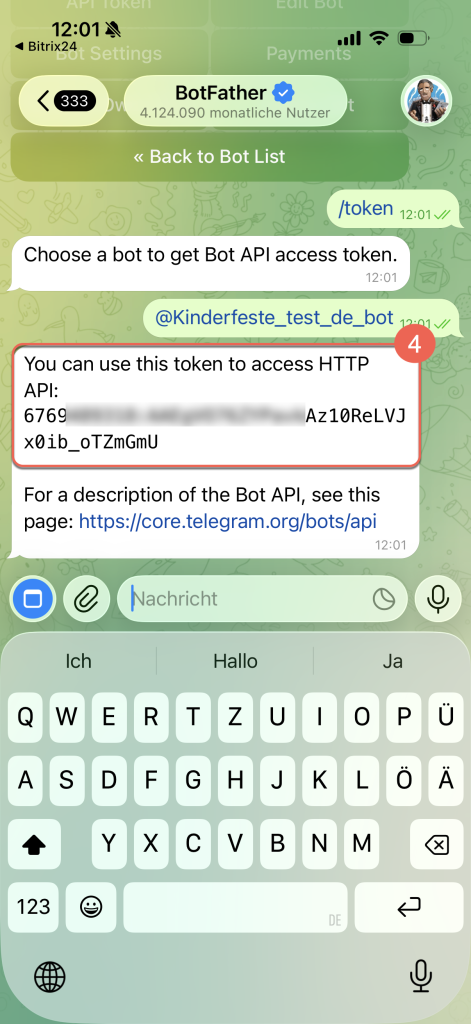 /token, um den aktuellen Token abzurufen, falls Sie ihn nicht mehr im Chat finden./revoke, um einen neuen Token zu generieren und den alten zu sperren. Wurde der Bot zuvor in anderen Bitrix24-Konten genutzt, funktionieren diese Verbindungen danach nicht mehr.