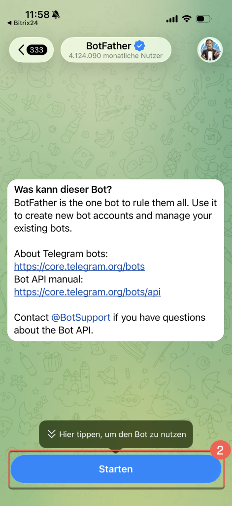 2. Danach öffnet sich in Ihrer Telegram-App der Chat mit dem Bot @BotFather. Dieser Bot erstellt neue Bots und stellt die erforderlichen Tokens bereit. Tippen Sie auf Starten.
