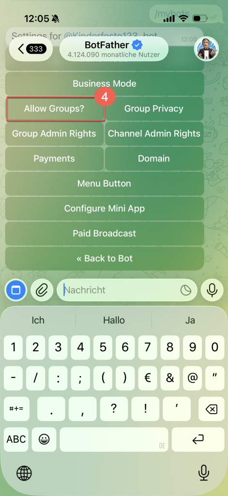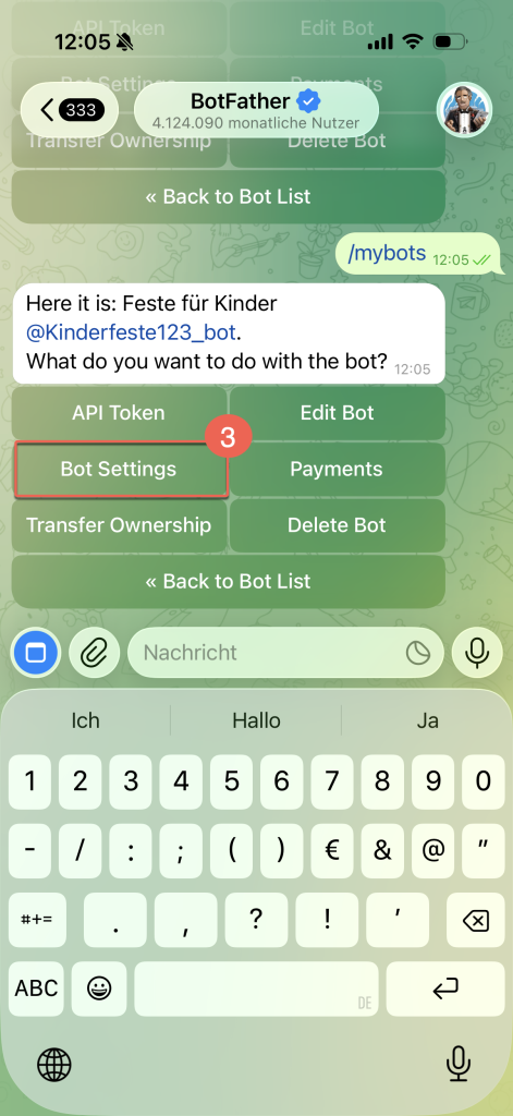 2. In Ihrer Telegram-App öffnet sich daraufhin der Chat mit @BotFather. Geben Sie einen der folgenden Befehle ein: